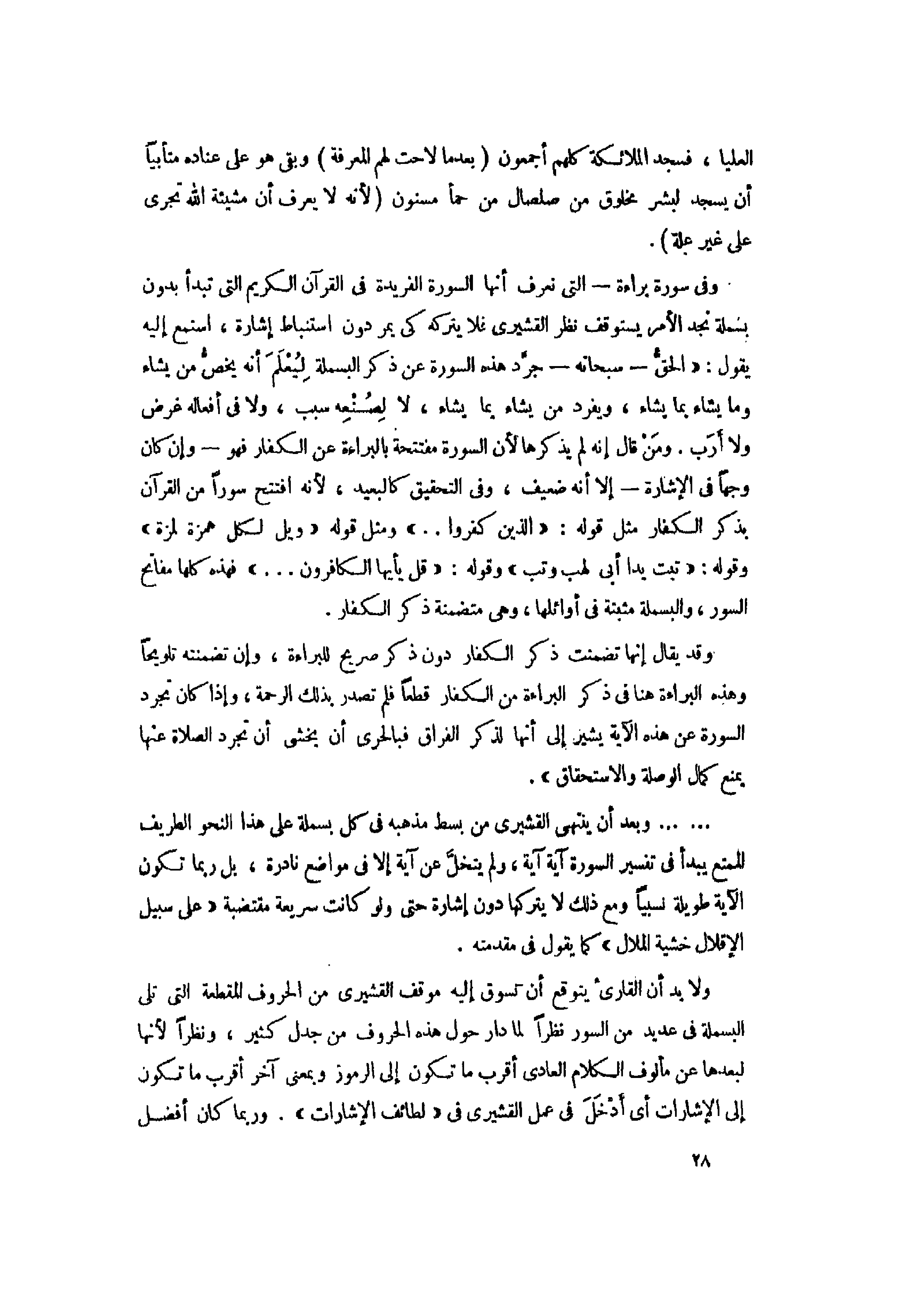وفى سورة براءة- التي نعرف أنها السورة الفريدة فى القرآن الكريم التي تبدأ بدون بسملة نجد الأمر يستوقف نظر القشيري فلا يتركه كى يمردون استنباط إشارة، استمع إليه يقول: «الحقّ- سبحانه- جرّد هذه السورة عن ذكر البسملة ليعلم أنه يخصّ من يشاء وما يشاء بما يشاء، ويفرد من يشاء بما يشاء، لا لصنعه سبب، ولا فى أفعاله غرض ولا أرب. ومن قال إنه لم يذكرها لأن السورة مفتتحة بالبراءة عن الكفار فهو- وإن كان وجها فى الإشارة- إلا أنه ضعيف، وفى التحقيق كالبعيد، لأنه افتتح سورا من القرآن بذكر الكفار مثل قوله: «الَّذِينَ كَفَرُوا ... » ومثل قوله «وَيْلٌ لِكُلِّ هُمَزَةٍ لُمَزَةٍ» وقوله: «تَبَّتْ يَدا أَبِي لَهَبٍ وَتَبَّ» وقوله: «قُلْ يا أَيُّهَا الْكافِرُونَ ... » فهذه كلها مفاتح السور، والبسملة مثبتة فى أوائلها، وهى متضمنة ذكر الكفار.