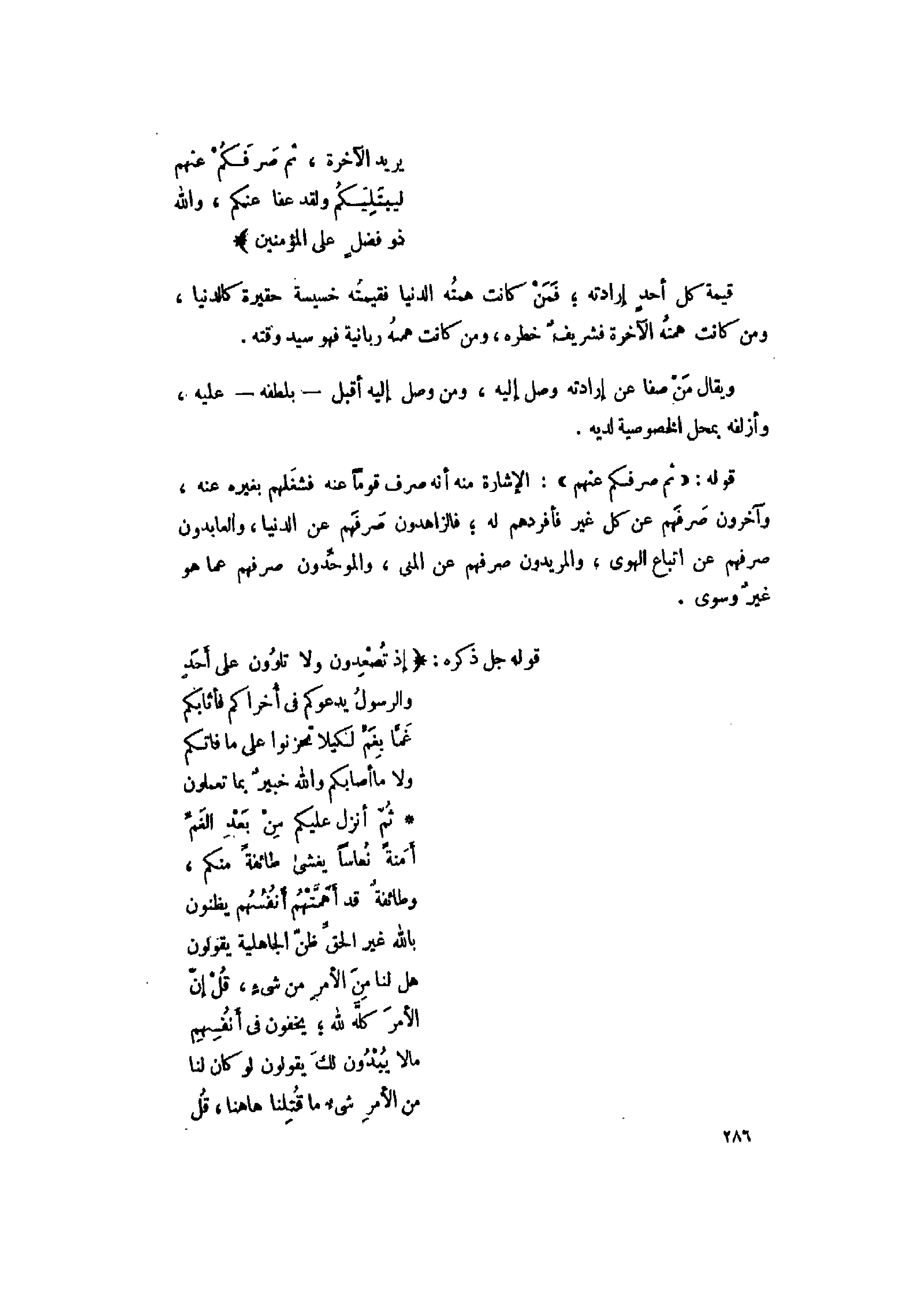 قوله: «ثُمَّ صَرَفَكُمْ عَنْهُمْ» : الإشارة منه أنه صرف قوما عنه فشغلهم بغيره عنه، وآخرون صرفهم عن كل غير فأفردهم له فالزاهدون صرفهم عن الدنيا، والعابدون صرفهم عن اتباع الهوى، والمريدون صرفهم عن المنى، والموحّدون صرفهم عما هو غير وسوى.