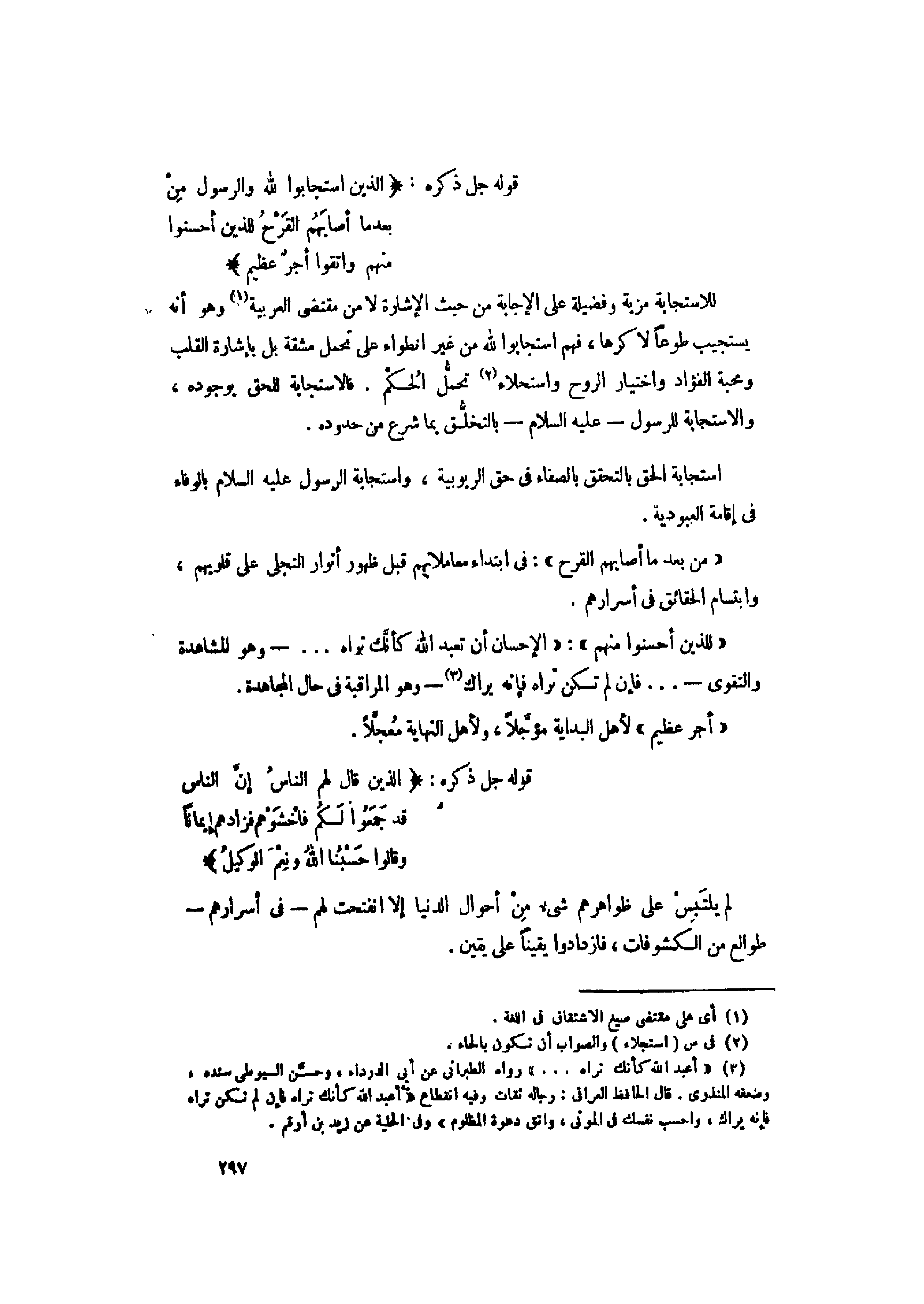 للاستجابة مزية وفضيلة على الإجابة من حيث الإشارة لا من مقتضى العربية «1» وهو أنه يستجيب طوعا لا كرها، فهم استجابوا لله من غير انطواء على تحمل مشقة بل بإشارة القلب ومحبة الفؤاد واختيار الروح واستحلاء «2» تحمّل الحكم. فالاستجابة للحق بوجوده، والاستجابة للرسول- عليه السّلام- بالتخلّق بما شرع من حدوده.