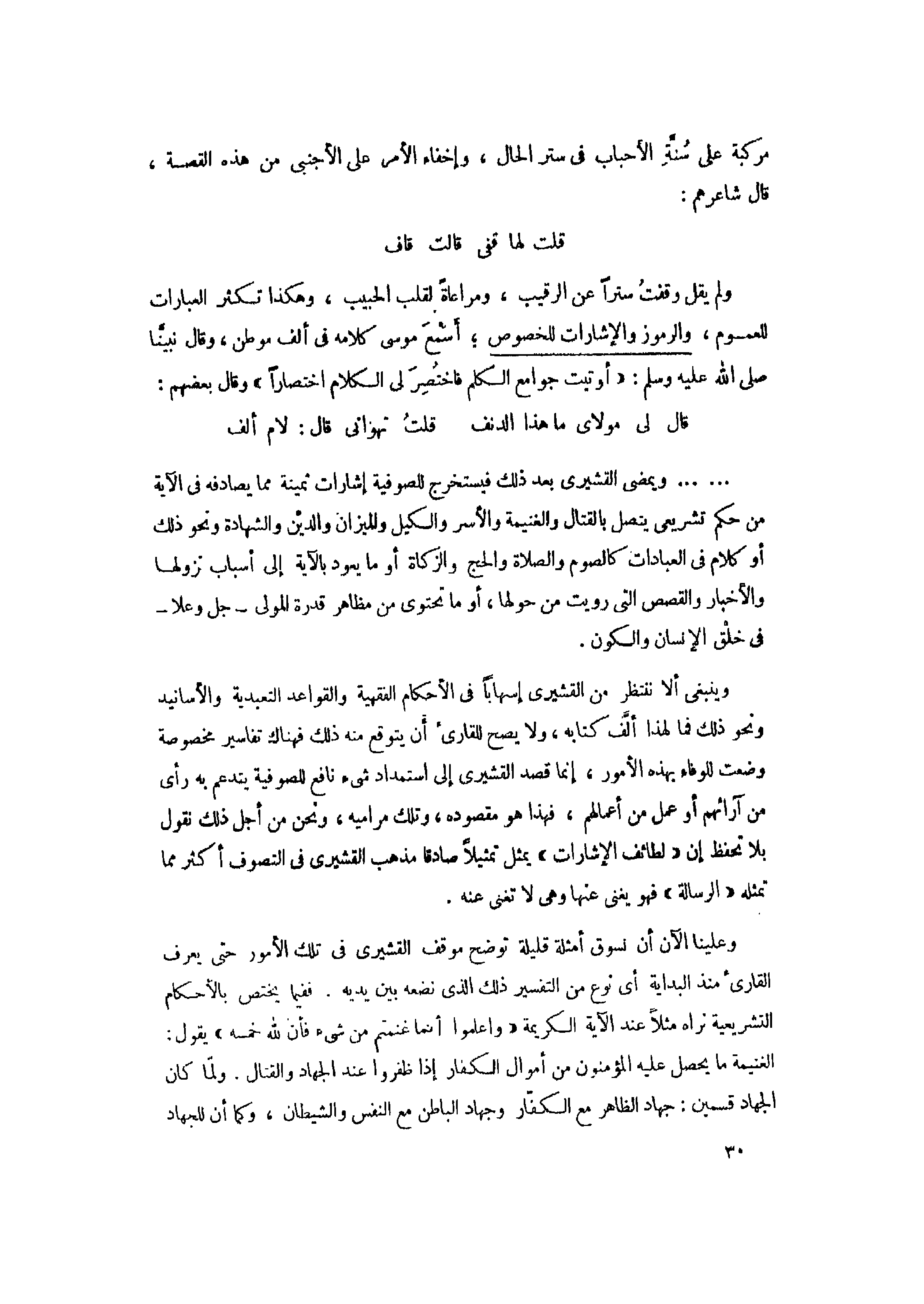وينبغى ألا ننتظر من القشيري إسهابا فى الأحكام الفقهية والقواعد التعبدية والأسانيد ونحو ذلك فما لهذا ألّف كتابه، ولا يصح للقارئ أن يتوقع منه ذلك فهناك تفاسير مخصوصة وضعت للوفاء بهذه الأمور، إنما قصد القشيري إلى استمداد شىء نافع للصوفية يتدعم به رأى من آرائهم أو عمل من أعمالهم، فهذا هو مقصوده، وتلك مراميه، ونحن من أجل ذلك نقول بلا تحفظ إن «لطائف الإشارات» يمثل تمثيلا صادقا مذهب القشيري فى التصوف أكثر مما تمثله «الرسالة» فهو يغنى عنها وهى لا تغنى عنه.