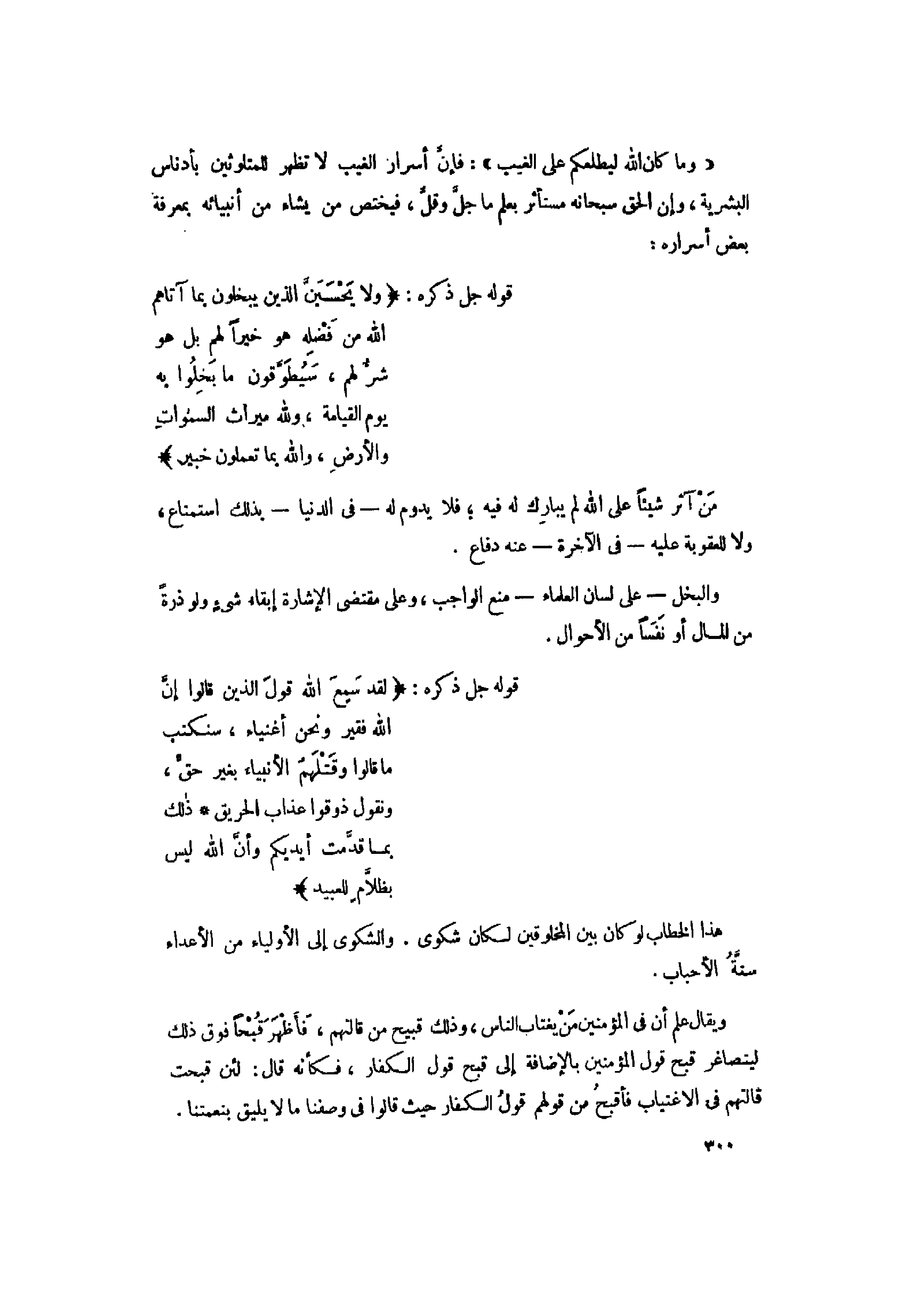 «وَما كانَ اللَّهُ لِيُطْلِعَكُمْ عَلَى الْغَيْبِ» : فإنّ أسرار الغيب لا تظهر للمتلوثين بأدناس البشرية، وإن الحق سبحانه مستأثر بعلم ما جلّ وقلّ، فيختص من يشاء من أنبيائه بمعرفة بعض أسراره: