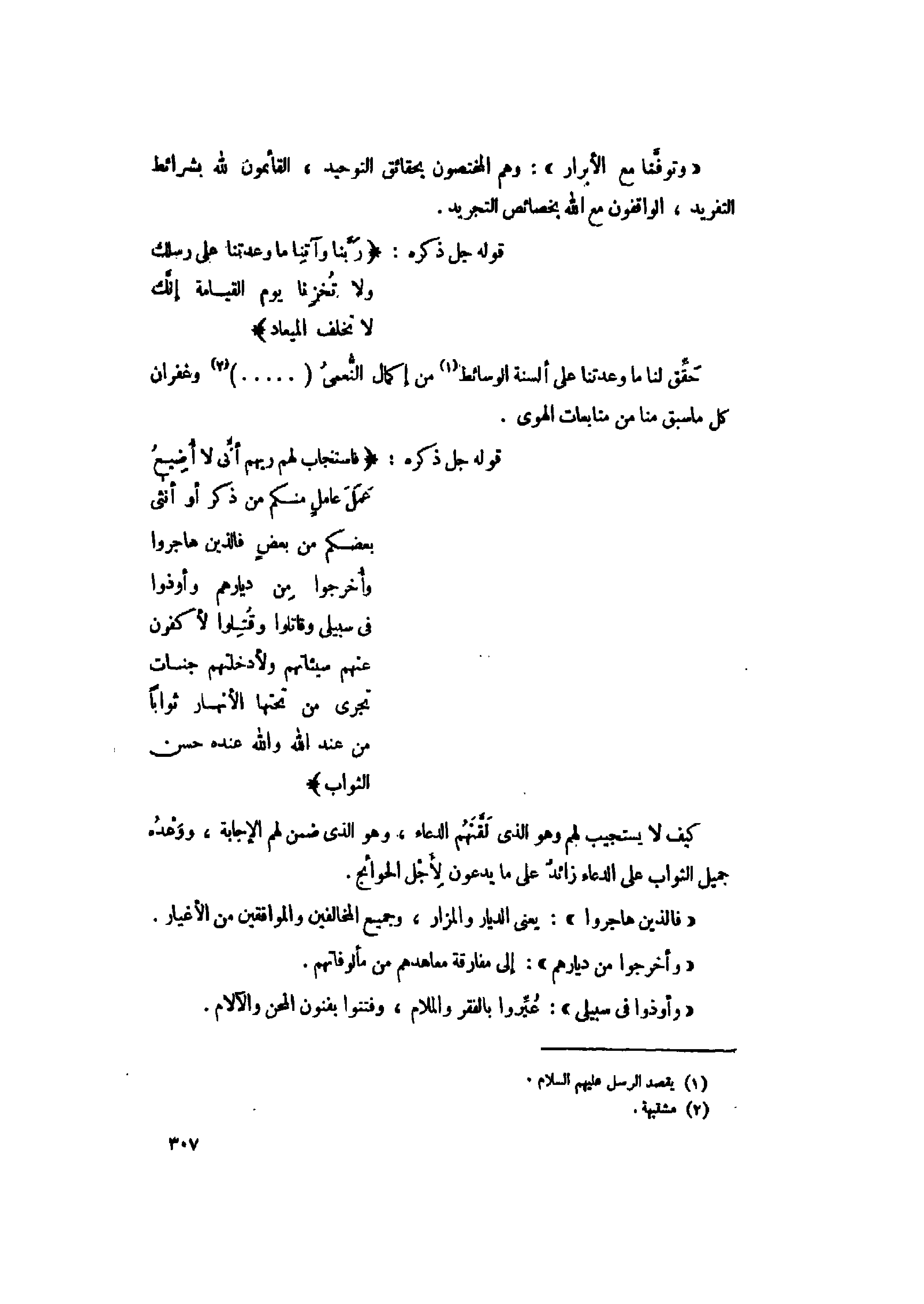 «وَتَوَفَّنا مَعَ الْأَبْرارِ» : وهم المختصون بحقائق التوحيد، القائمون لله بشرائط التفريد، الواقفون مع الله بخصائص التجريد.