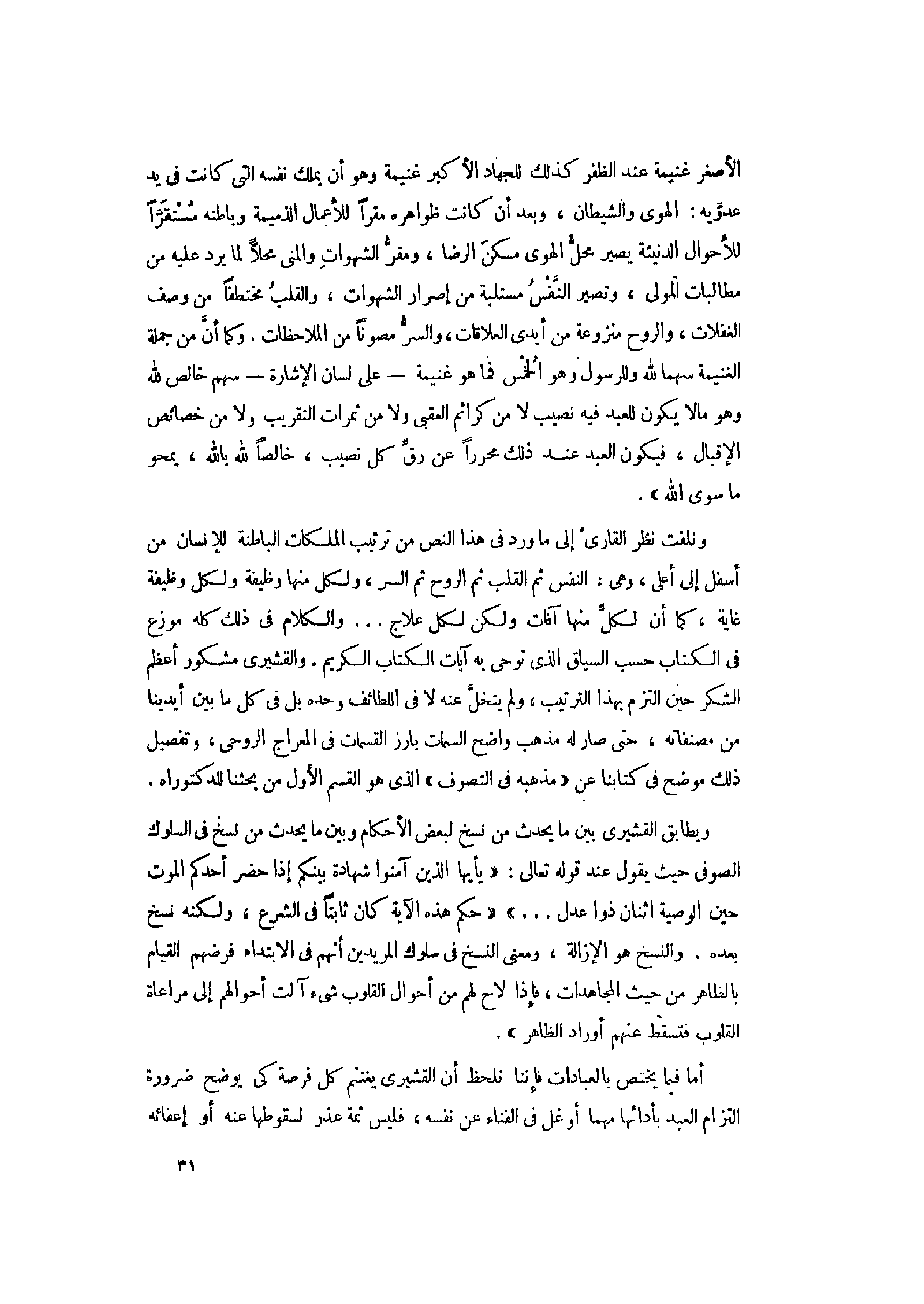 ونلفت نظر القارئ إلى ما ورد فى هذا النص من ترتيب الملكات الباطنة للإنسان من أسفل إلى أعلى، وهى: النفس ثم القلب ثم الروح ثم السر، ولكل منها وظيفة ولكل وظيفة غاية، كما أن لكلّ منها آفات ولكن لكل علاج ... والكلام فى ذلك كله موزع فى الكتاب حسب السياق الذي توحى به آيات الكتاب الكريم. والقشيري مشكور أعظم الشكر حين التزم بهذا الترتيب، ولم يتخلّ عنه لا فى اللطائف وحده بل فى كل ما بين أيدينا من مصنفاته، حتى صار له مذهب واضح السمات بارز القسمات فى المعراج الروحي، وتفصيل ذلك موضح فى كتابنا عن «مذهبه فى التصوف» الذي هو القسم الأول من بحثنا للدكتوراه.