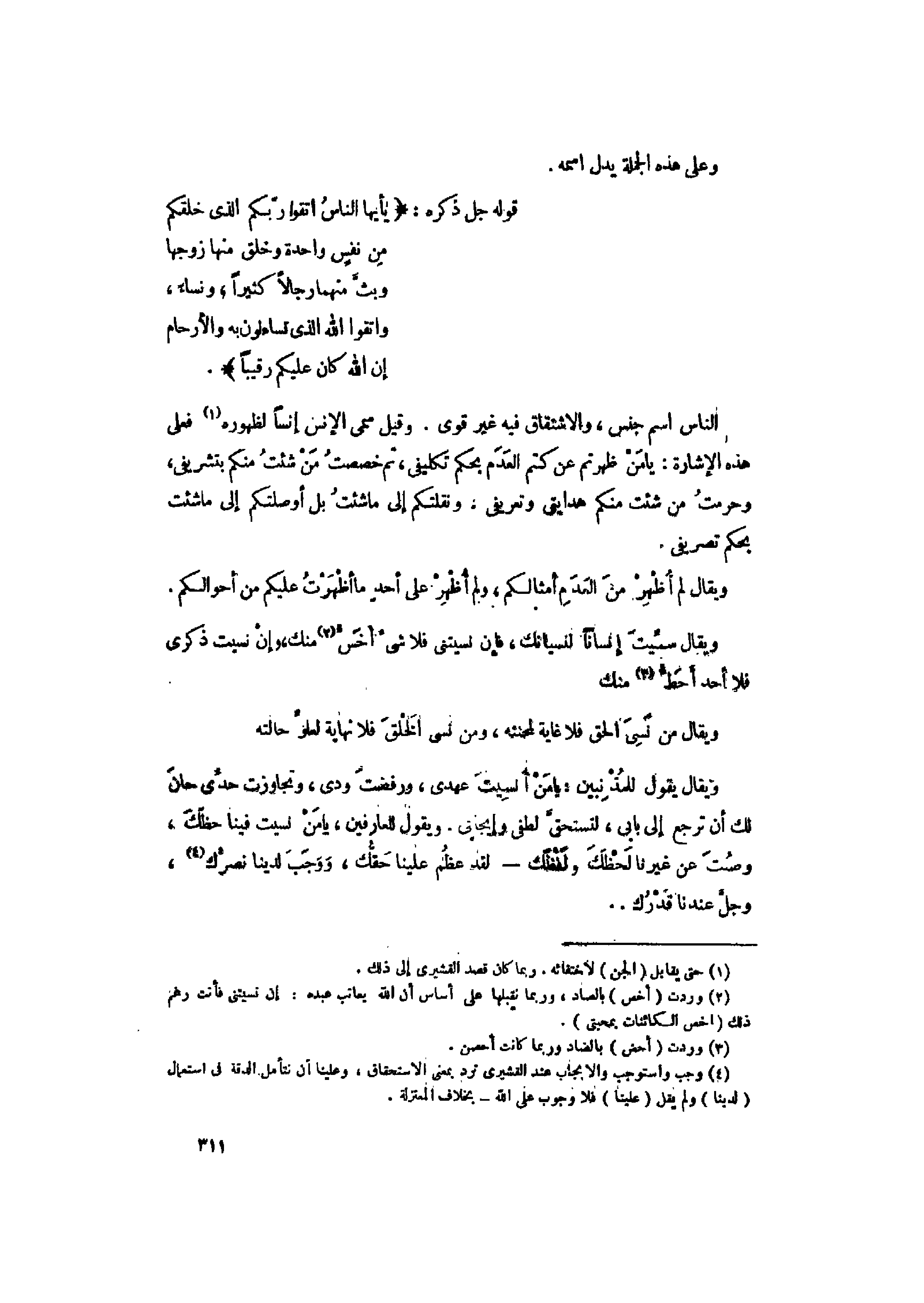 يا أَيُّهَا النَّاسُ اتَّقُوا رَبَّكُمُ الَّذِي خَلَقَكُمْ مِنْ نَفْسٍ واحِدَةٍ وَخَلَقَ مِنْها زَوْجَها وَبَثَّ مِنْهُما رِجالاً كَثِيراً وَنِساءً وَاتَّقُوا اللَّهَ الَّذِي تَسائَلُونَ بِهِ وَالْأَرْحامَ إِنَّ اللَّهَ كانَ عَلَيْكُمْ رَقِيباً (1)