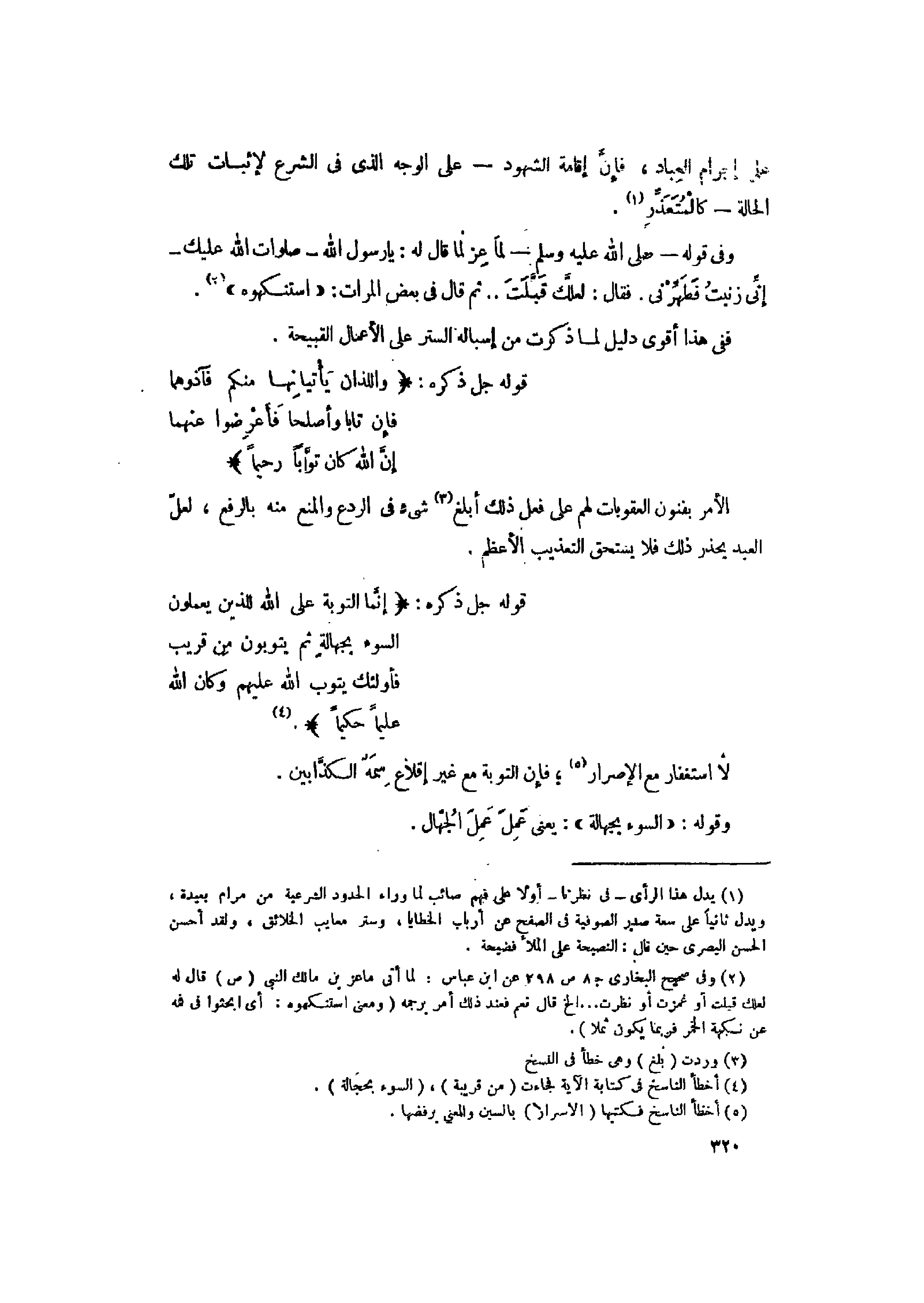 (1) يدل هذا الرأى- فى نظرنا- أولا على فهم صائب لما وراء الحدود الشرعية من مرام بعيدة، ويدل ثانيا على سعة صدر الصوفية فى الصفح عن أرباب الخطايا، وستر معايب الخلائق، ولقد أحسن الحسن البصري حين قال: النصيحة على الملأ فضيحة.