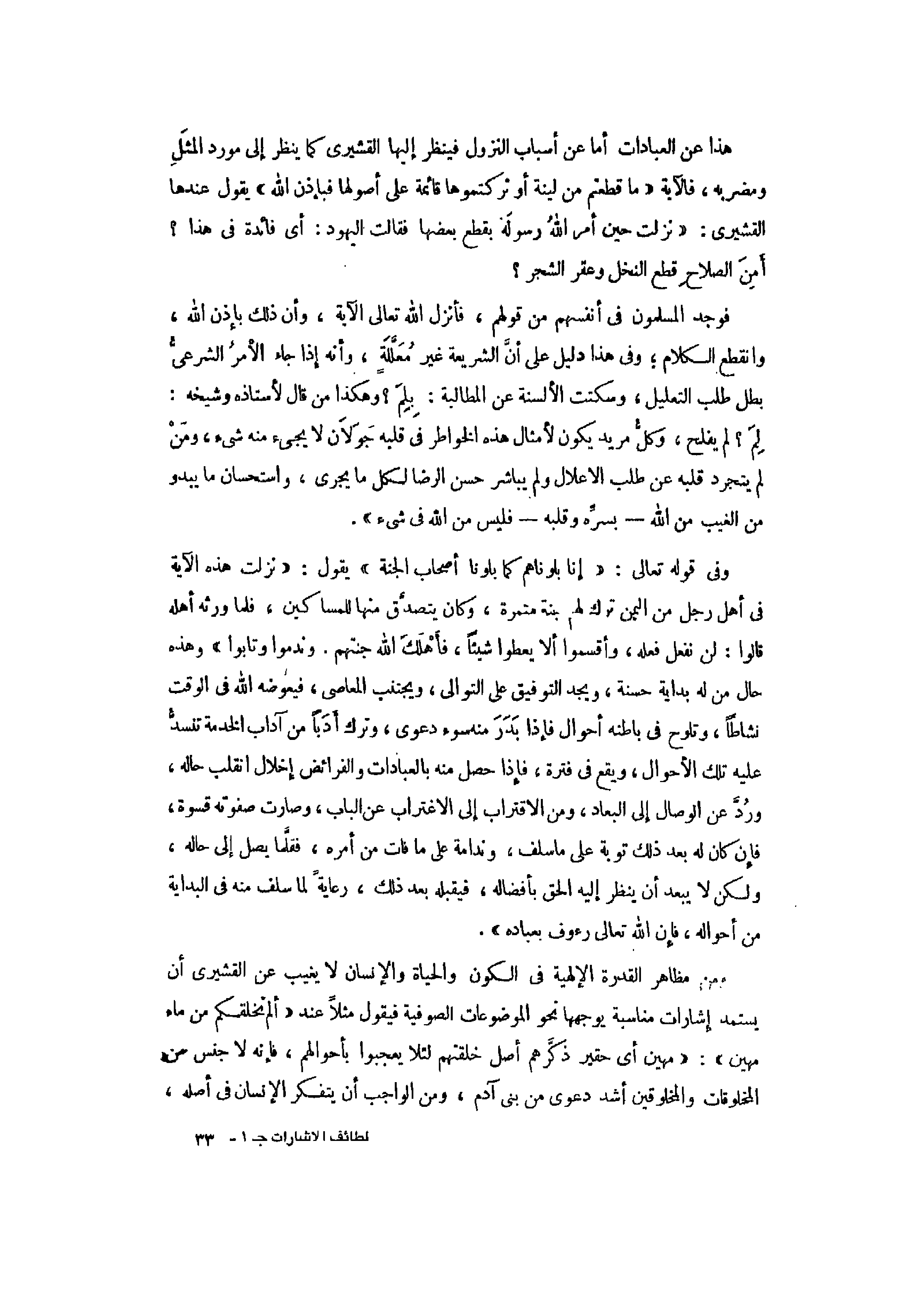 هذا عن العبادات أما عن أسباب النزول فينظر إليها القشيري كما ينظر إلى مورد المثل ومضربه، فالآية «ما قَطَعْتُمْ مِنْ لِينَةٍ أَوْ تَرَكْتُمُوها قائِمَةً عَلى أُصُولِها فَبِإِذْنِ اللَّهِ» يقول عندها القشيري: «نزلت حين أمر الله رسوله بقطع بعضها فقالت اليهود: أي فائدة فى هذا؟