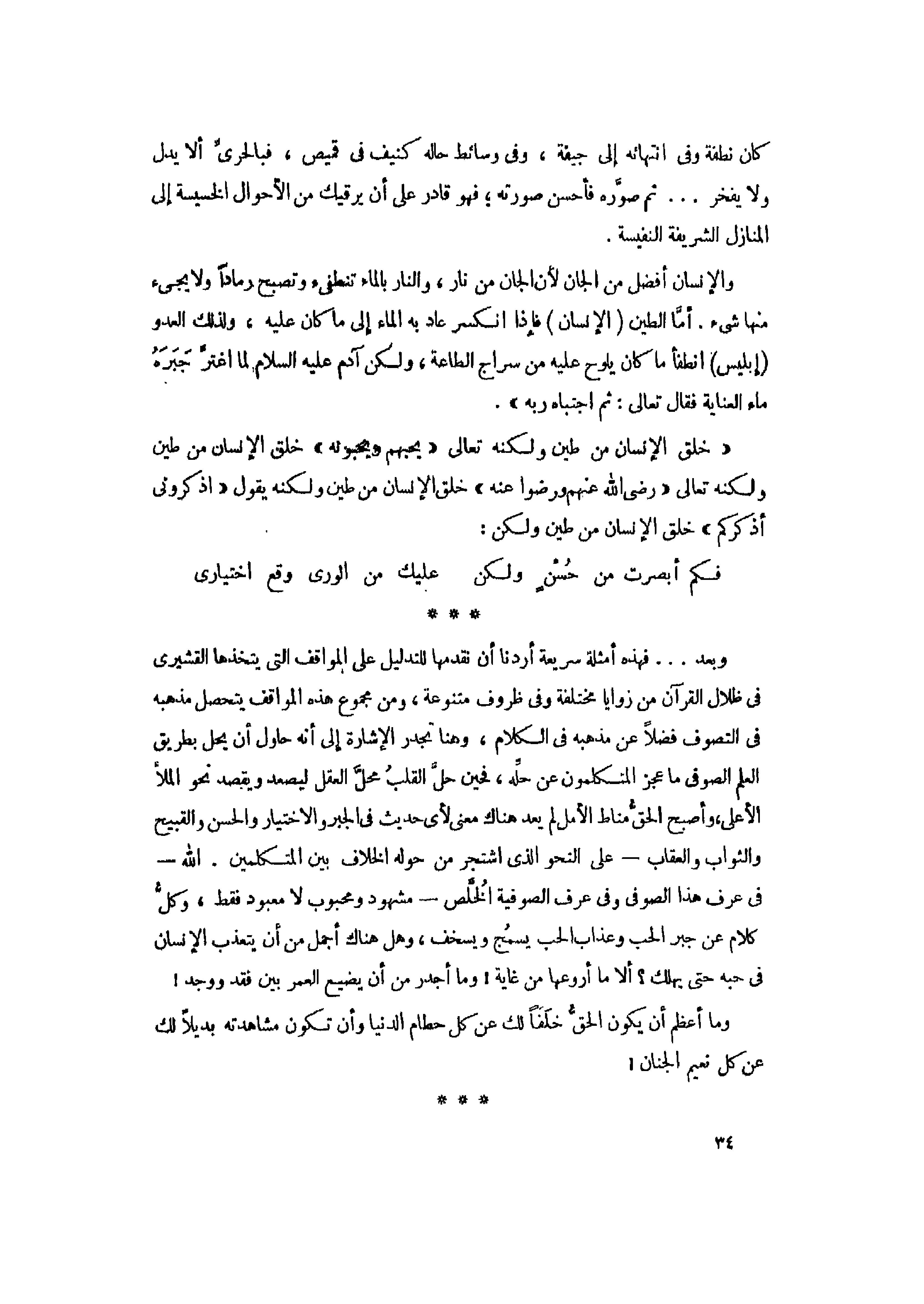 وبعد ... فهذه أمثلة سريعة أردنا أن نقدمها للتدليل على المواقف التي يتخذها القشيري فى ظلال القرآن من زوايا مختلفة وفى ظروف متنوعة، ومن مجموع هذه المواقف يتحصل مذهبه فى التصوف فضلا عن مذهبه فى الكلام، وهنا تجدر الإشارة إلى أنه حاول أن يحل بطريق العلم الصوفي ما عجز المتكلمون عن حلّه، فحين حلّ القلب محلّ العقل ليصعد ويقصد نحو الملأ الأعلى، وأصبح الحقّ مناط الأمل لم يعد هناك معنى لأى حديث فى الجبر والاختيار والحسن والقبيح والثواب والعقاب- على النحو الذي اشتجر من حوله الخلاف بين المتكلمين. الله- فى عرف هذا الصوفي وفى عرف الصوفية الخلّص- مشهود ومحبوب لا معبود فقط، وكلّ كلام عن جبر الحب وعذاب الحب يسمج ويسخف، وهل هناك أجمل من أن يتعذب الإنسان فى حبه حتى يهلك؟ ألا ما أروعها من غاية! وما أجدر من أن يضيع العمر بين فقد ووجد! وما أعظم أن يكون الحقّ خلفا لك عن كل حطام الدنيا وأن تكون مشاهدته بديلا لك عن كل نعيم الجنان!