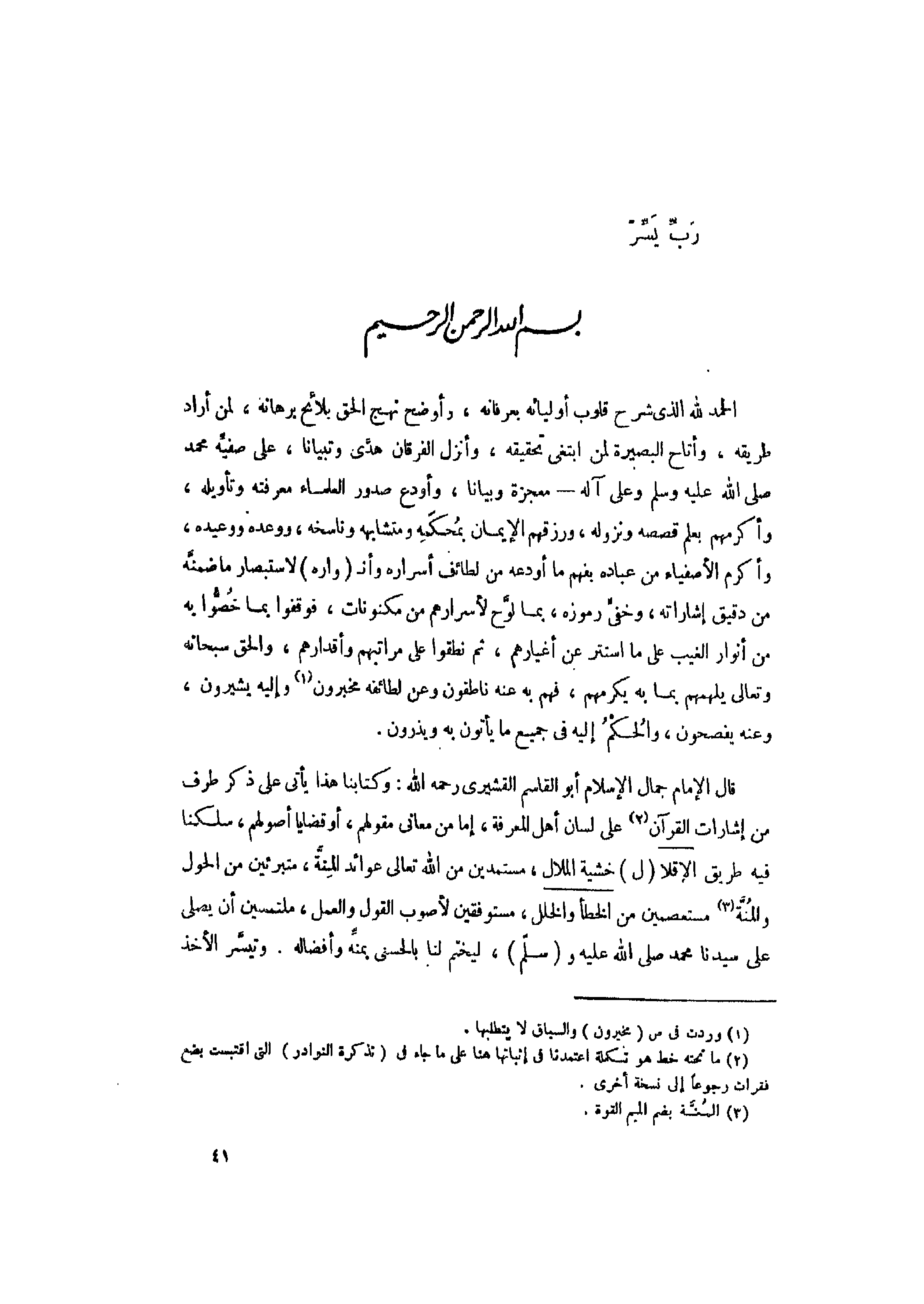 ربّ يسّر بسم الله الرحمن الرحيم الحمد لله الذي شرح قلوب أوليائه بعرفانه، وأوضح نهج الحق بلائح برهانه، لمن أراد طريقه، وأتاح البصيرة لمن ابتغى تحقيقه، وأنزل الفرقان هدى وتبيانا، على صفيّه محمد صلّى الله عليه وسلّم وعلى آله- معجزة وبيانا، وأودع صدور العلماء معرفته وتأويله، وأكرمهم بعلم قصصه ونزوله، ورزقهم الإيمان بمحكمه ومتشابهه وناسخه، ووعده ووعيده، وأكرم الأصفياء من عباده بفهم ما أودعه من لطائف أسراره وأن (واره) لاستبصار ما ضمنّه من دقيق إشاراته، وخفىّ رموزه، بما لوّح لأسرارهم من مكنونات، فوقفوا بما خصّوا به من أنوار الغيب على ما استتر عن أغيارهم، ثم نطقوا على مراتبهم وأقدارهم، والحق سبحانه وتعالى يلهمهم بما به يكرمهم، فهم به عنه ناطقون وعن لطائفه مخبرون «1» وإليه يشيرون، وعنه يفصحون، والحكم إليه فى جميع ما يأتون به ويذرون.