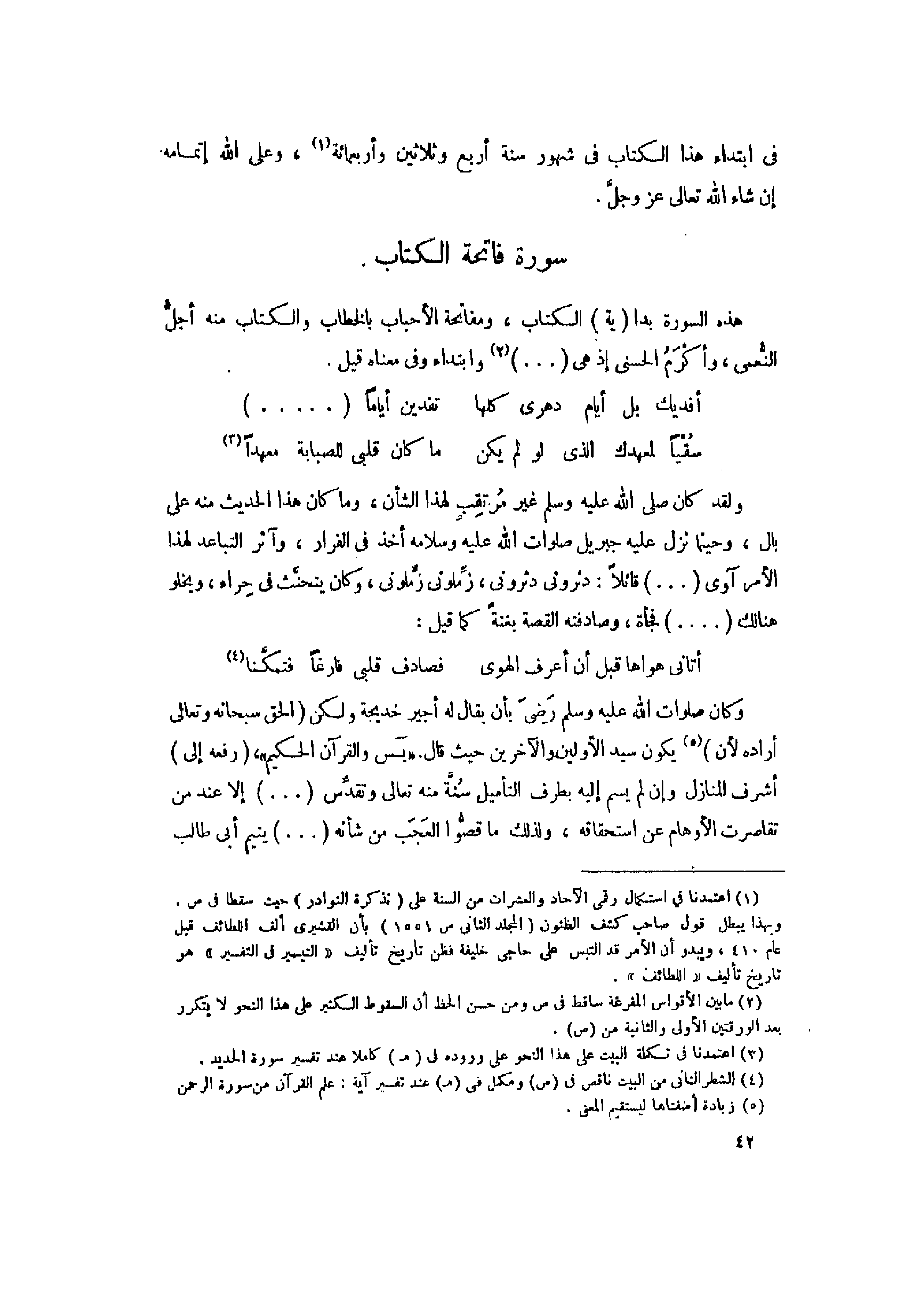 (2) ما بين الأقواس المفرغة ساقط فى ص ومن حسن الحظ أن السقوط الكثير على هذا النحو لا يتكرر بعد الورقتين الأولى والثانية من (ص) .