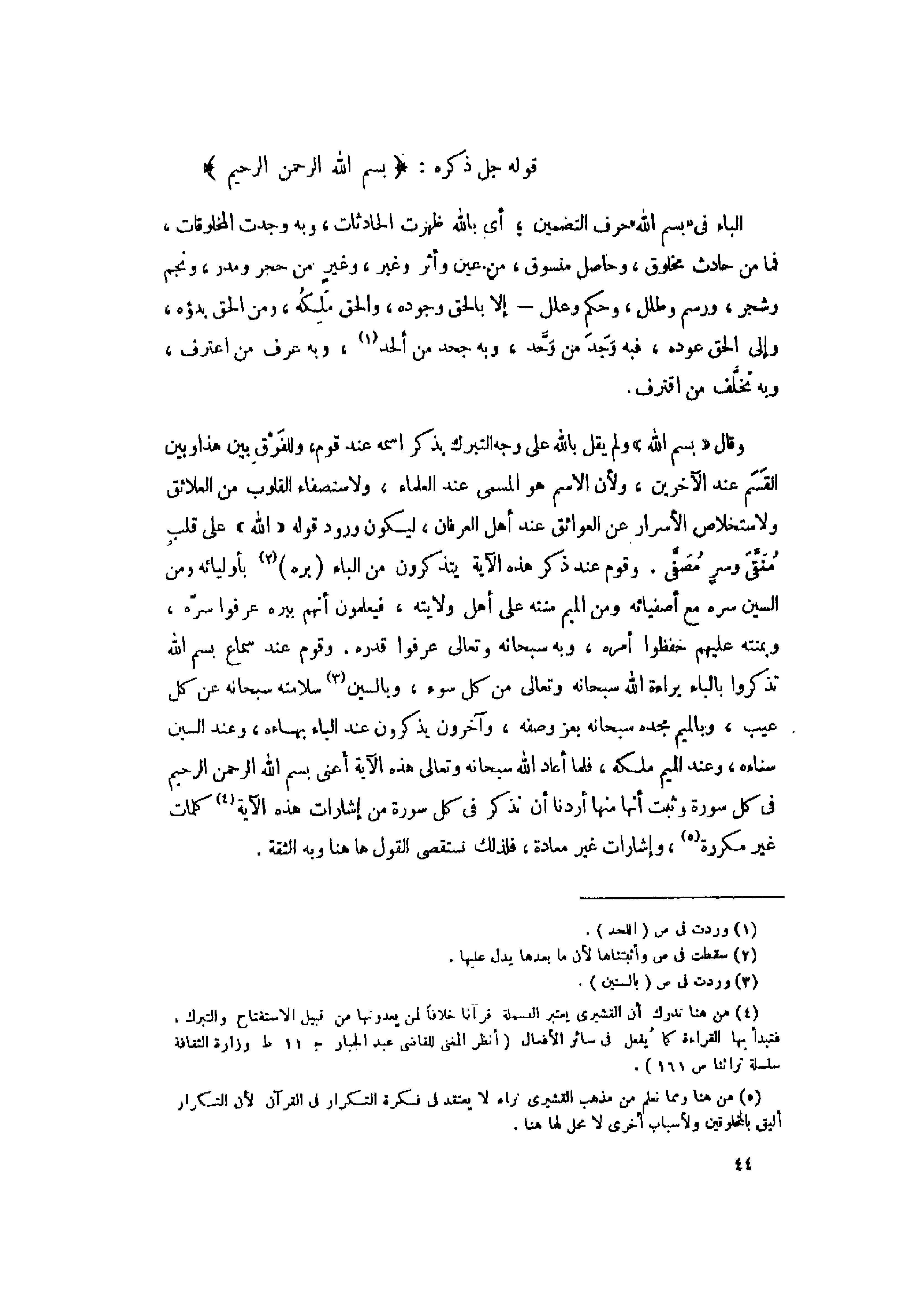 (4) من هنا ندرك أن القشيري يعتبر البسملة قرآنا خلافا لمن يعدونها من قبيل الاستفتاح والتبرك، فتبدأ بها القراءة كما يفعل فى سائر الأفعال (أنظر المغني للقاضى عبد الجبار ج 11 ط وزارة الثقافة سلسلة تراثنا ص 161) .