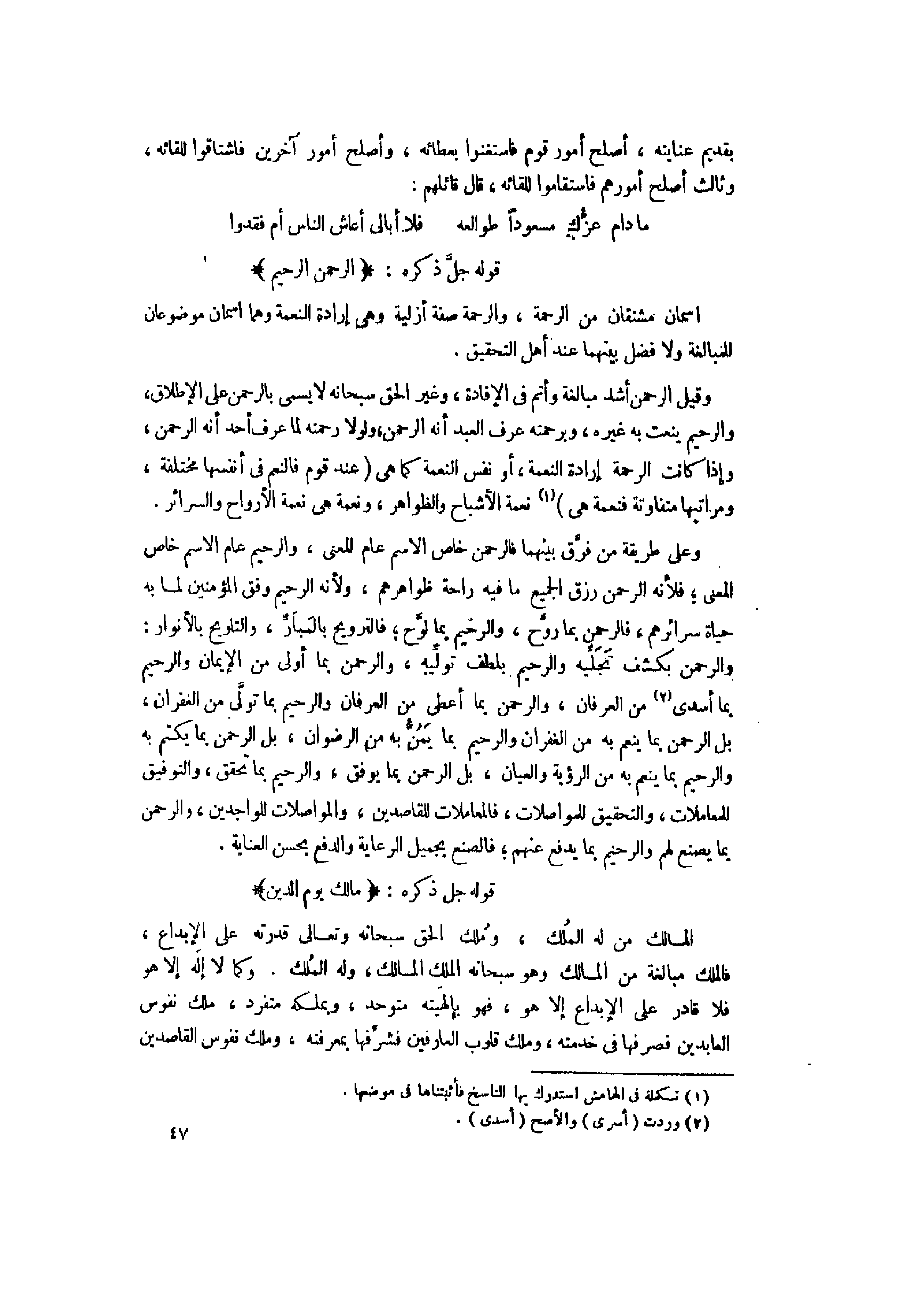 وقيل الرحمن أشد مبالغة وأتم فى الإفادة، وغير الحق سبحانه لا يسمى بالرحمن على الإطلاق، والرحيم ينعت به غيره، وبرحمته عرف العبد أنه الرحمن، ولولا رحمته لما عرف أحد أنه الرحمن، وإذا كانت الرحمة إرادة النعمة، أو نفس النعمة كما هى (عند قوم فالنعم فى أنفسها مختلفة، ومراتبها متفاوتة فنعمة هى) «1» نعمة الأشباح والظواهر، ونعمة هى نعمة الأرواح والأسرار.