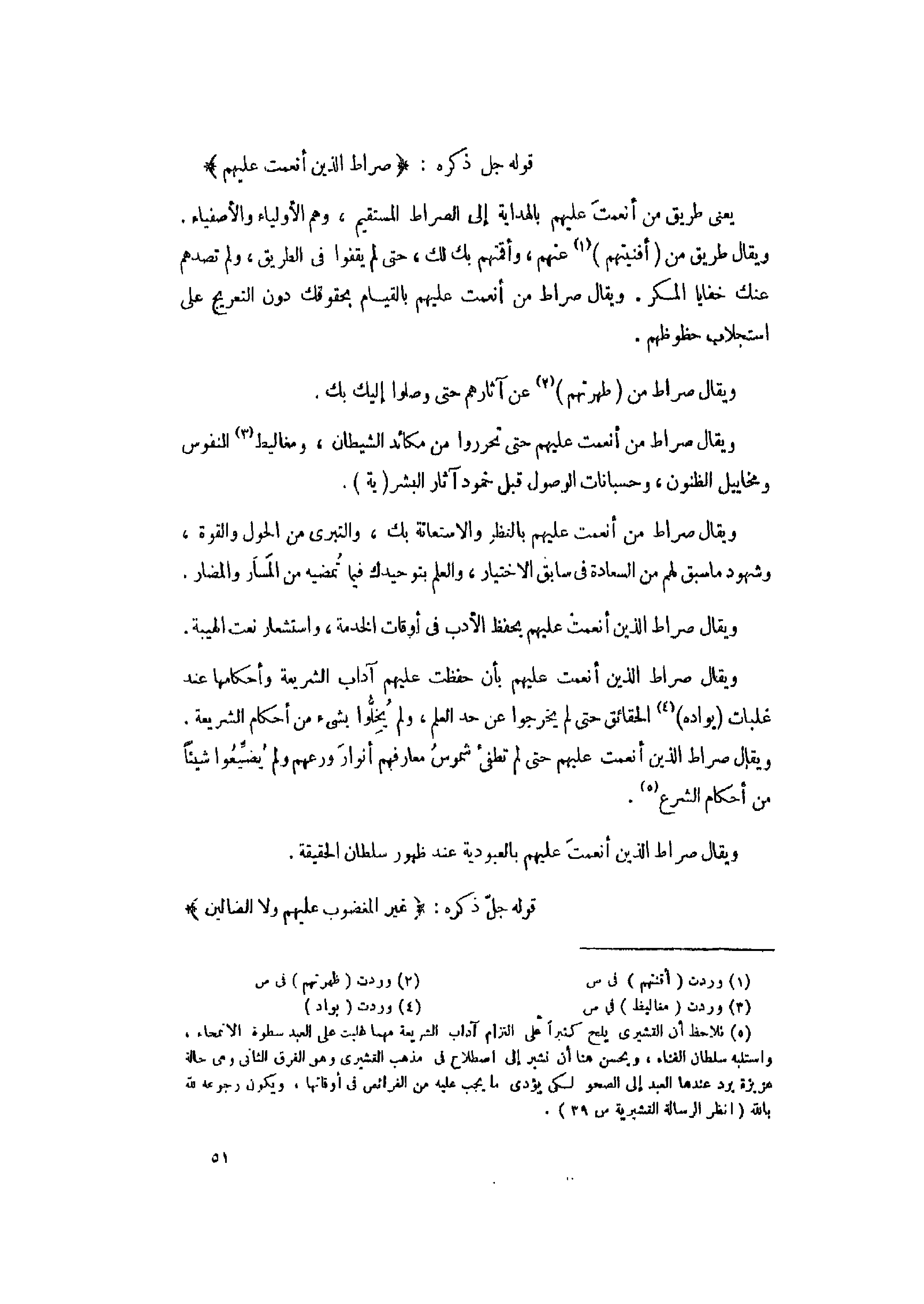 ويقال صراط من أنعمت عليهم حتى تحرروا من مكائد الشيطان، ومغاليط «3» النفوس ومخاييل الظنون، وحسبانات الوصول قبل خمود آثار البشر (ية) .