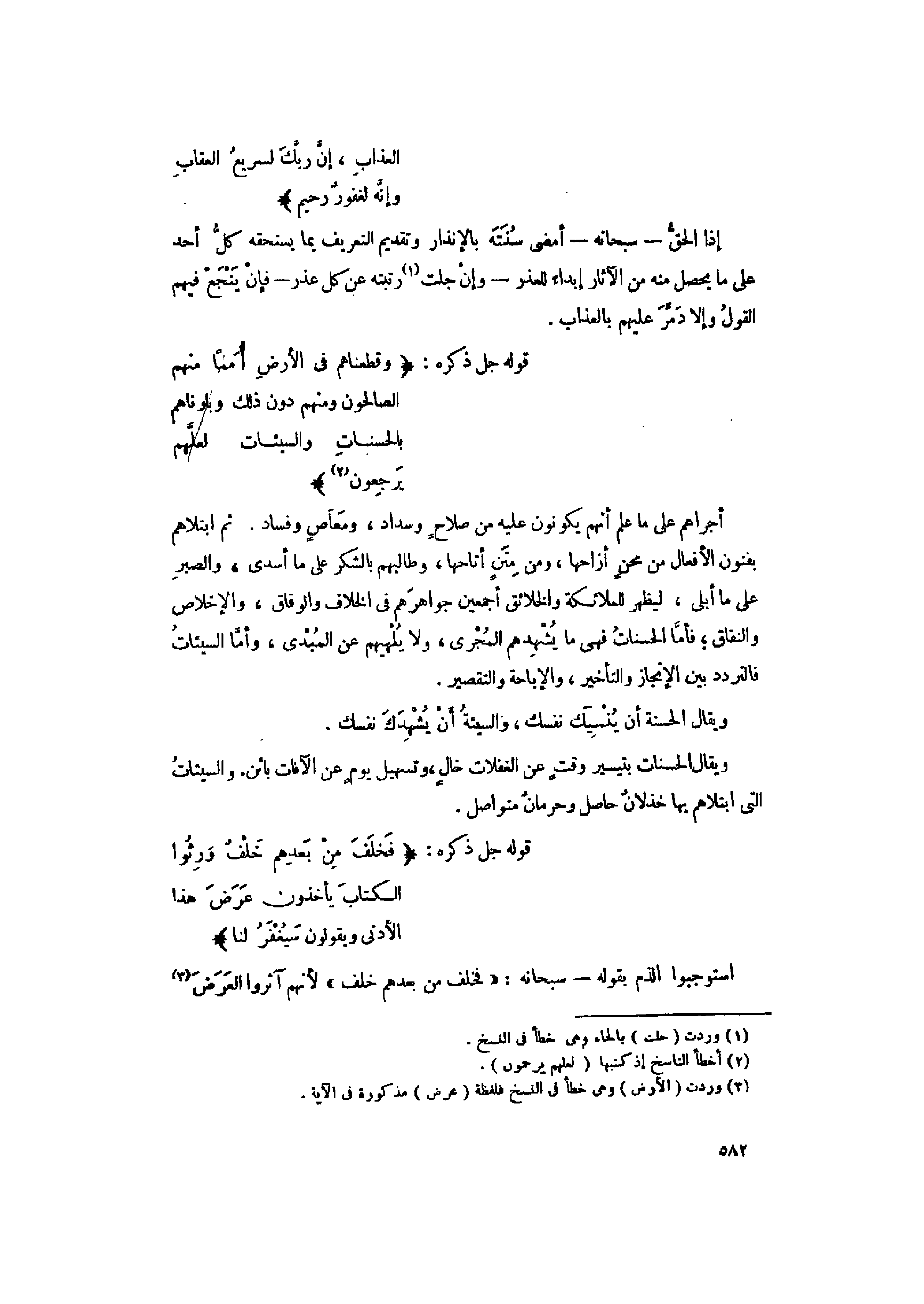 «2» أجراهم على ما علم أنهم يكونون عليه من صلاح وسداد، ومعاص وفساد. ثم ابتلاهم بفنون الأفعال من محن أزاحها، ومن منن أتاحها، وطالبهم بالشكر على ما أسدى، والصبر على ما أبلى، ليظهر للملائكة والخلائق أجمعين جواهرهم فى الخلاف والوفاق، والإخلاص والنفاق فأمّا الحسنات فهى ما يشهدهم المجرى، ولا يلهيهم عن المبدى، وأمّا السيئات فالتردد بين الإنجاز والتأخير، والإباحة والتقصير.