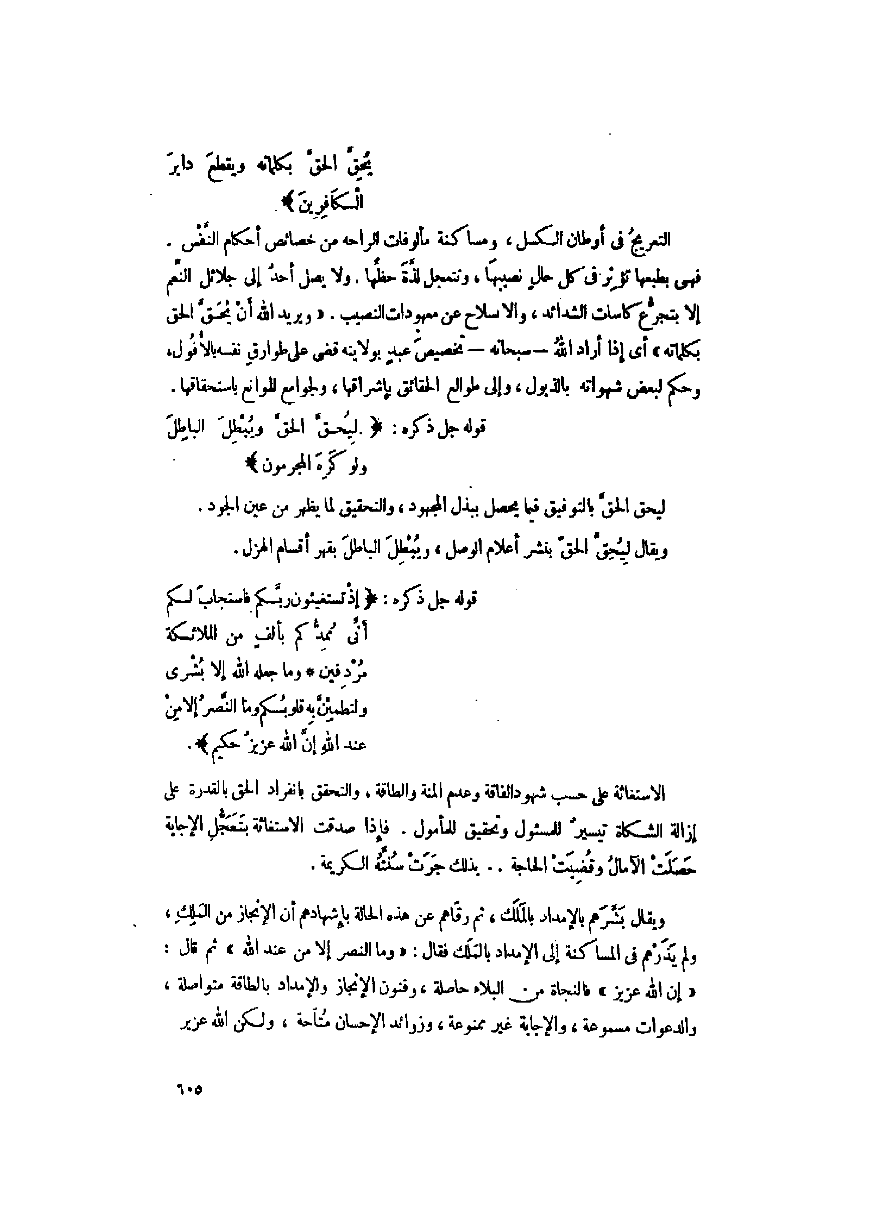 فهى بطبعها تؤثر فى كل حال نصيبها، وتتمجل لذّة حظّها. ولا يصل أحد إلى جلائل النّعم إلا بتجرّع كاسات الشدائد، والانسلاخ عن معهودات النصيب. «وَيُرِيدُ اللَّهُ أَنْ يُحِقَّ الْحَقَّ بِكَلِماتِهِ» أي إذا أراد الله- سبحانه- تخصيص عبد بولايته قضى على طوارق نفسه بالأفول، وحكم لبعض شهواته بالذبول، وإلى طوالع الحقائق بإشراقها، ولجوامع الموانع باستحقاقها.