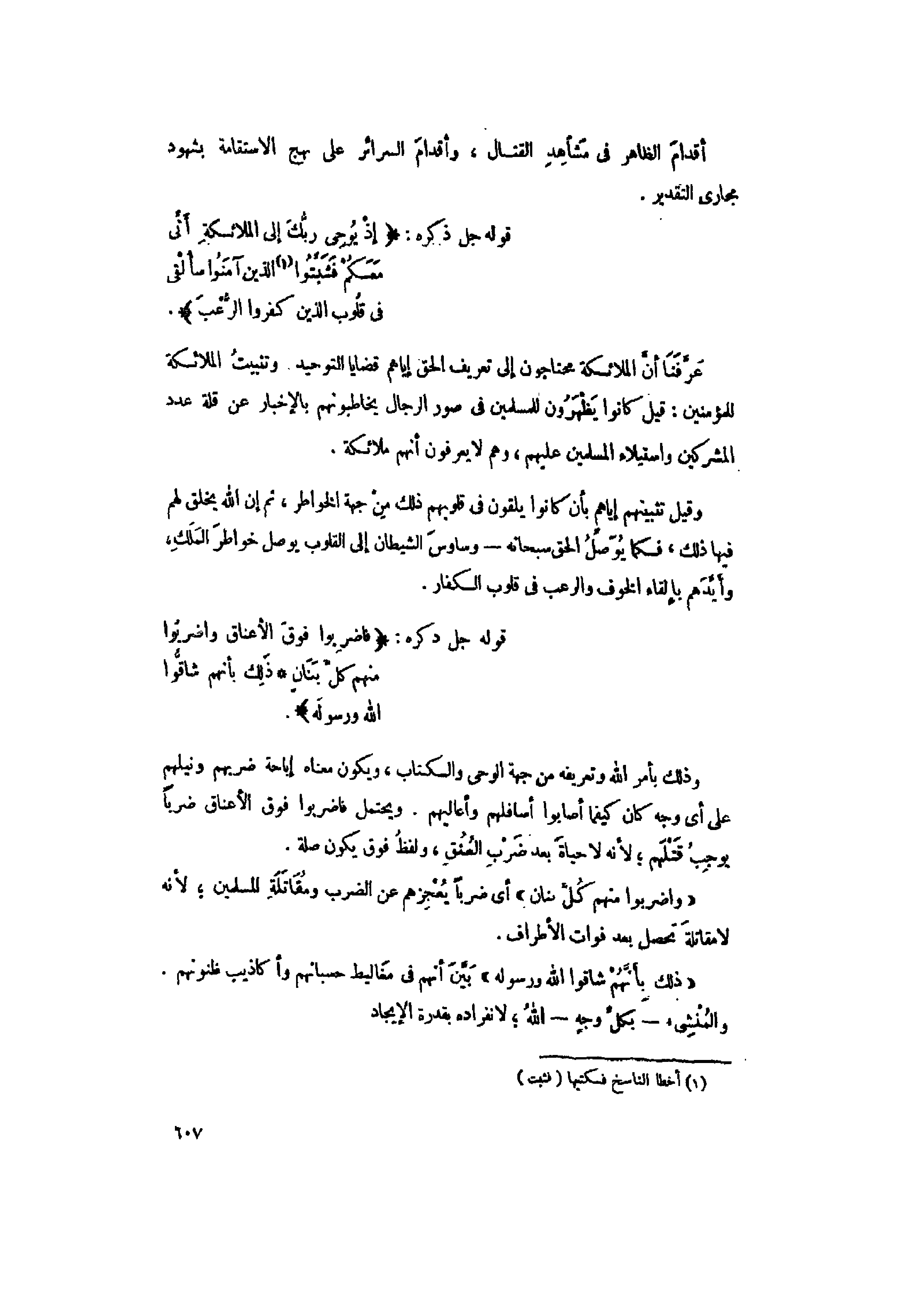 «1» عرّفنا أنّ الملائكة محتاجون إلى تعريف الحق إياهم قضايا التوحيد وتثبيت الملائكة للمؤمنين: قيل كانوا يظهرون للمسلمين فى صور الرجال يخاطبونهم بالإخبار عن قلة عدد المشركين واستيلاء المسلمين عليهم، وهم لا يعرفون أنهم ملائكة.