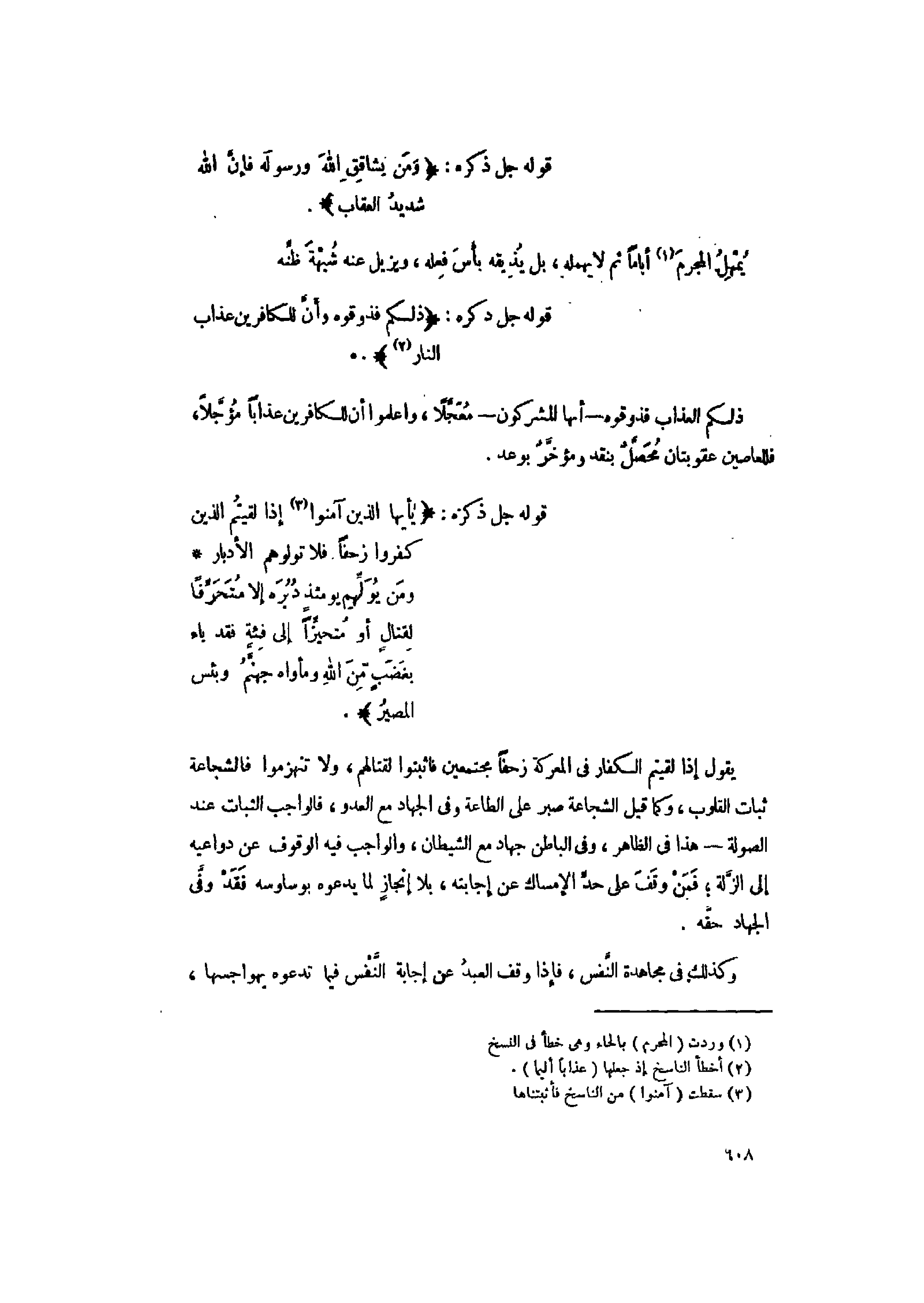 «3» يقول إذا لقيتم الكفار فى المعركة زحفا مجتمعين فاثبتوا لقتالهم، ولا تنهزموا فالشجاعة ثبات القلوب، وكما قيل الشجاعة صبر على الطاعة وفى الجهاد مع العدو، فالواجب الثبات عند الصولة- هذا فى الظاهر، وفى الباطن جهاد مع الشيطان، والواجب فيه الوقوف عن دواعيه إلى الزّلة فمن وقف على حدّ الإمساك عن إجابته، بلا إنجاز لما يدعوه بوساوسه فقد وفّى الجهاد حقّه.