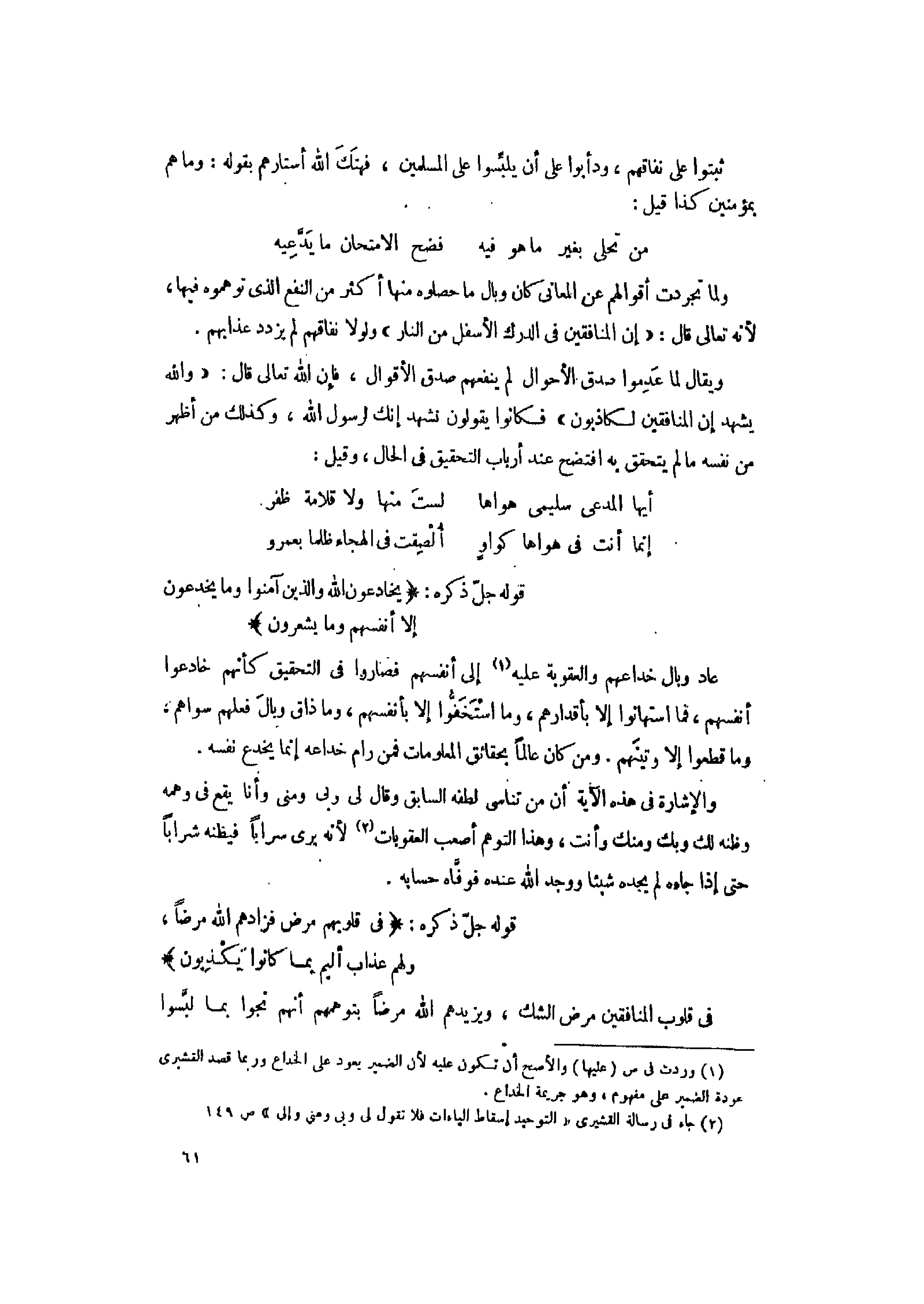 (1) وردت فى ص (عليها) والأصح أن تكون عليه لأن الضمير يعود على الخداع وربما قصد القشيري عودة الضمير على مفهوم، وهو جريمة الخداع.