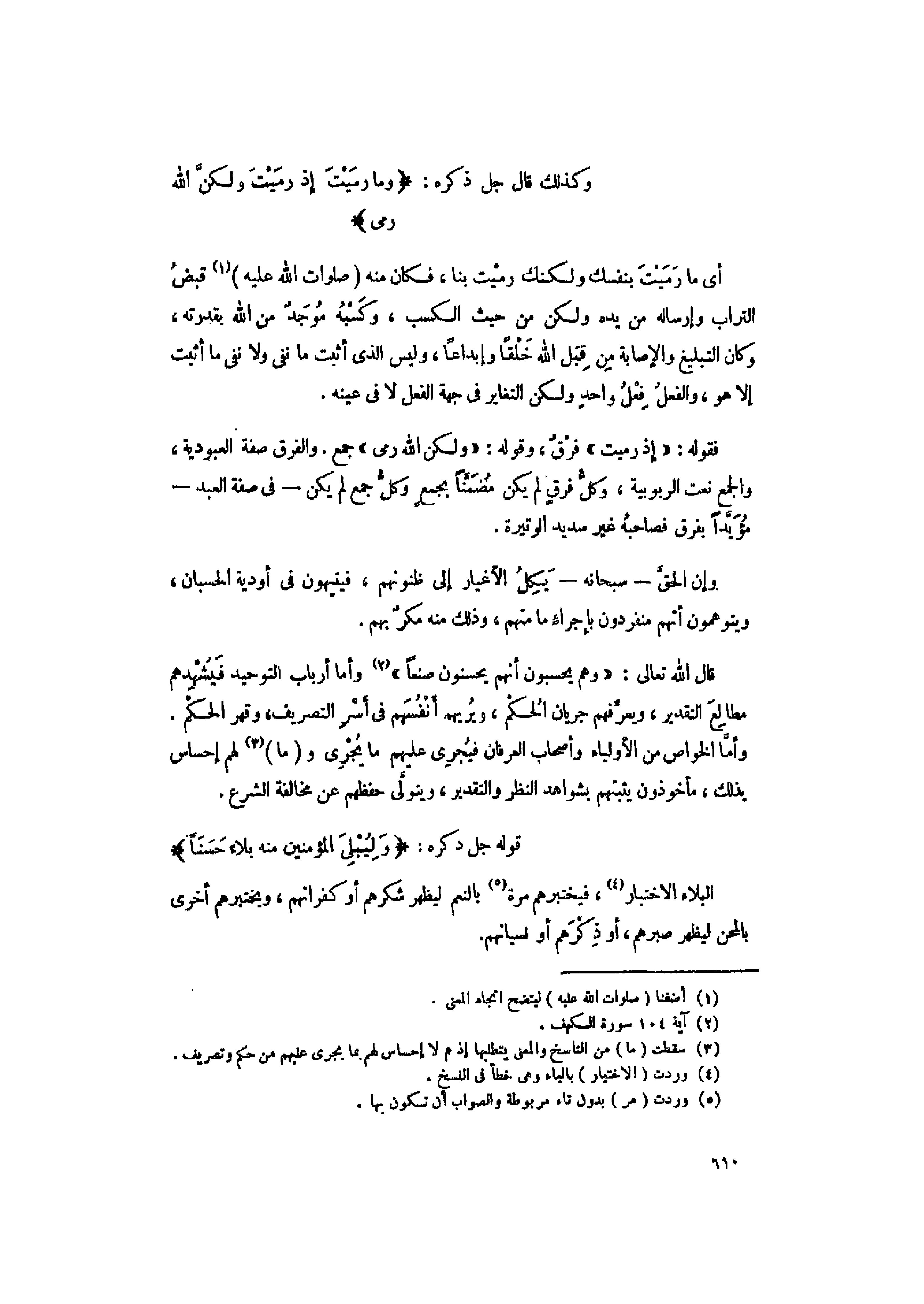 أي ما رميت بنفسك ولكنك رميت بنا، فكان منه (صلوات الله عليه) «1» قبض التراب وإرساله من يده ولكن من حيث الكسب، وكسبه موجد من الله بقدرته، وكان التبليغ والإصابة من قبل الله خلقا وإبداعا، وليس الذي أثبت ما نفى ولا نفى ما أثبت إلا هو، والفعل فعل واحد ولكن التغاير فى جهة الفعل لا فى عينه.
