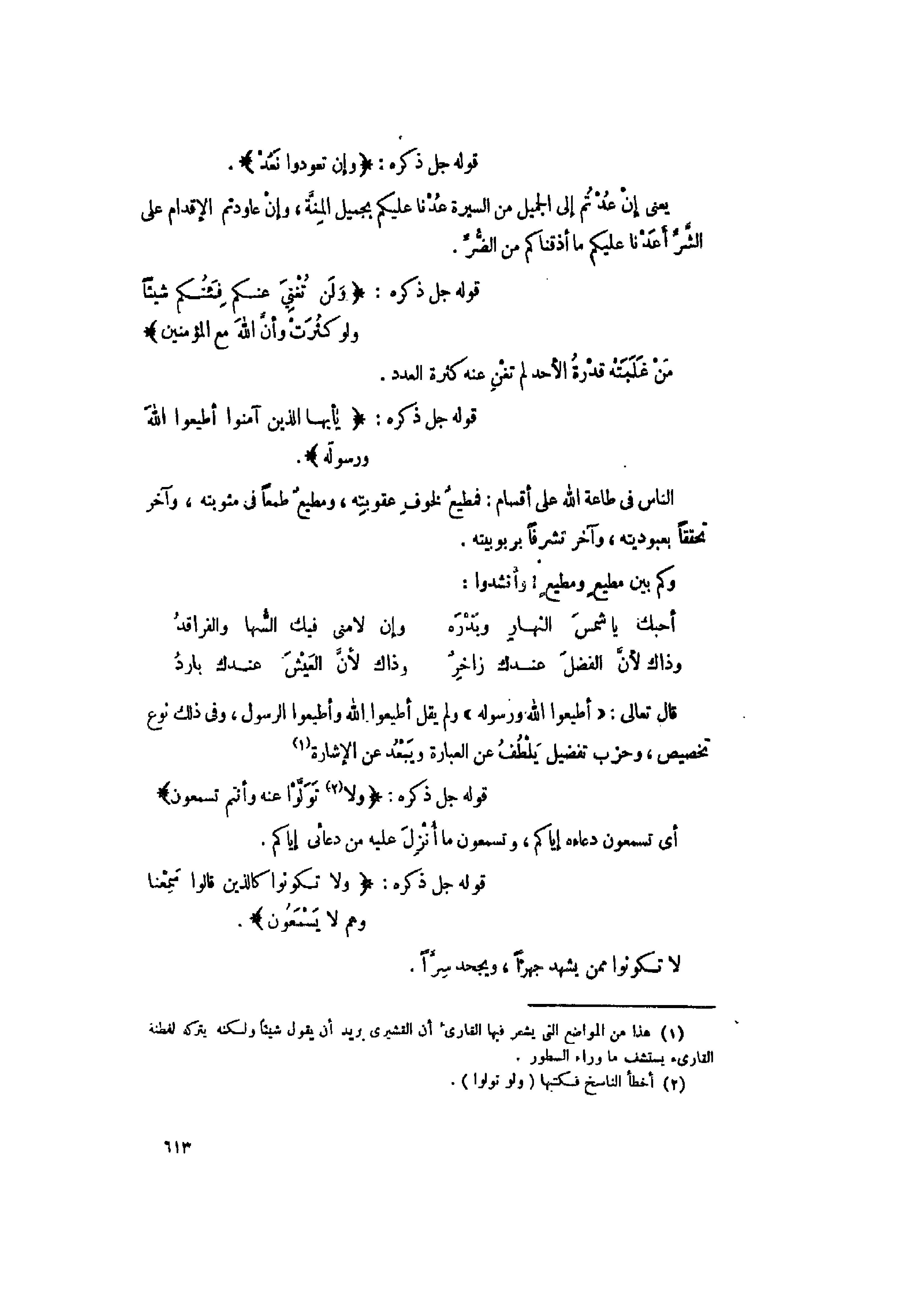 قال تعالى: «أَطِيعُوا اللَّهَ وَرَسُولَهُ» ولم يقل أطيعوا الله وأطيعوا الرسول، وفى ذلك نوع تخصيص، وحزب تفضيل يلطف عن العبارة ويبعد عن الإشارة «1» قوله جل ذكره: وَلا «2» تَوَلَّوْا عَنْهُ وَأَنْتُمْ تَسْمَعُونَ.