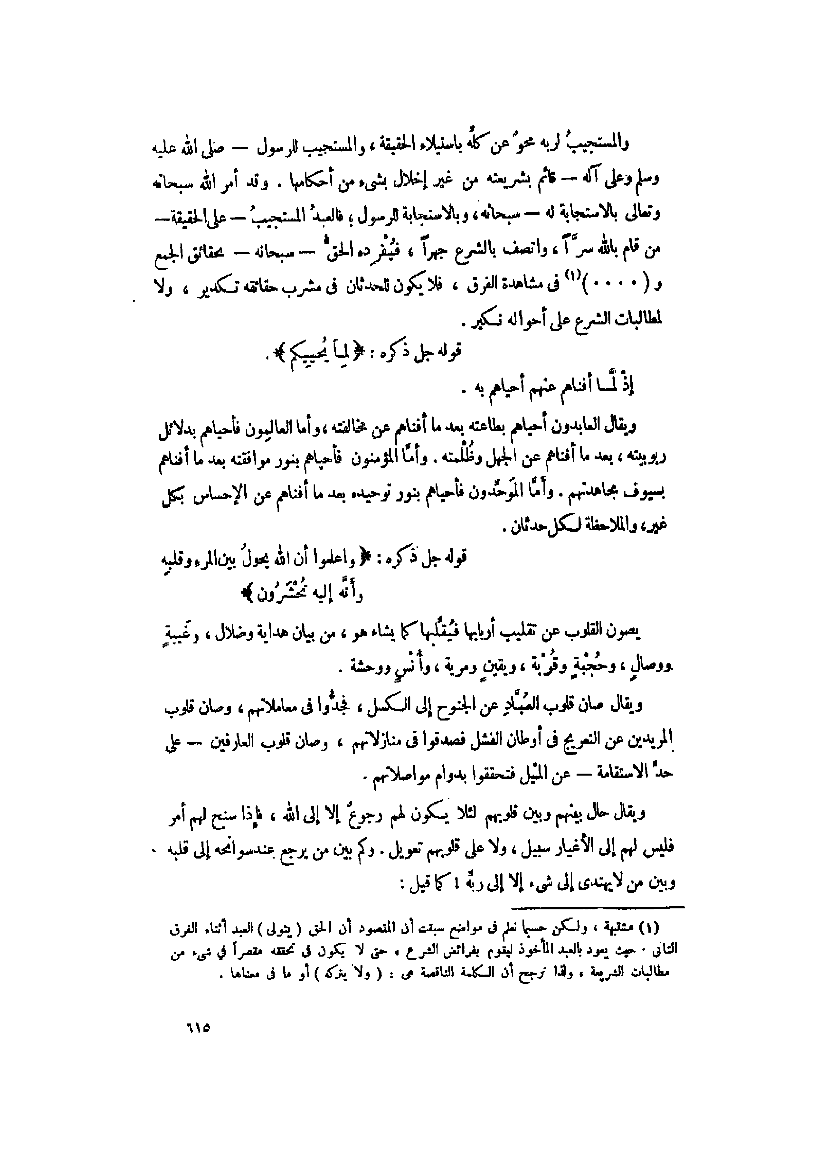 والمستجيب لربه محو عن كلّه باستيلاء الحقيقة، والمستجيب للرسول- صلّى الله عليه وسلّم وعلى آله- قائم بشريعته من غير إخلال بشىء من أحكامها. وقد أمر الله سبحانه وتعالى بالاستجابة له- سبحانه، وبالاستجابة للرسول فالعبد المستجيب- على الحقيقة- من قام بالله سرّا، واتصف بالشرع جهرا، فيفرده الحقّ- سبحانه- بحقائق الجمع و (....) «1» فى مشاهدة الفرق، فلا يكون للحدثان فى مشرب حقائقه تكدير، ولا لمطالبات الشرع على أحواله نكير.