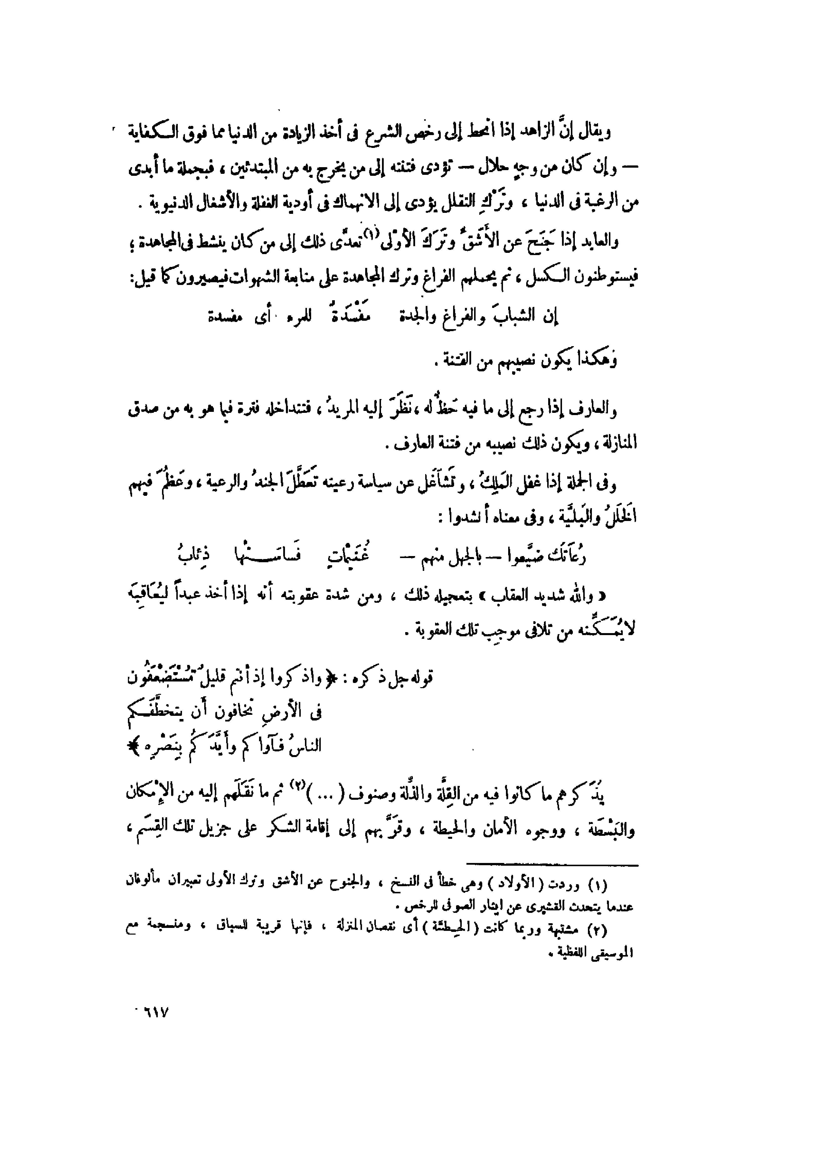 (1) وردت (الأولاد) وهى خطأ فى النسخ، والجنوح عن الأشق وترك الأولى تعبيران مألوفان عند ما يتحدث القشيري عن إيثار الصوفي للرخص.