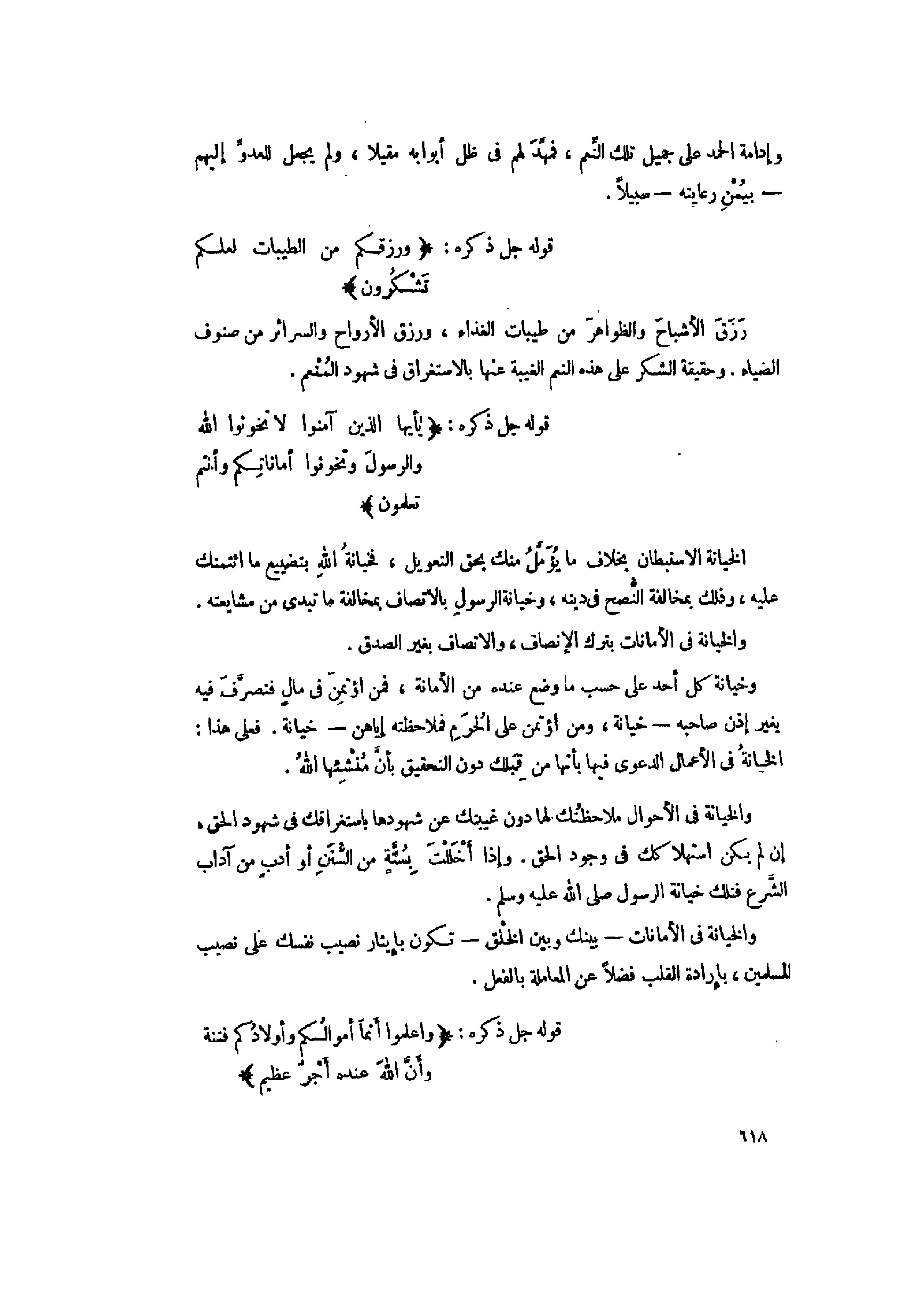 والخيانة فى الأمانات- بينك وبين الخلق- تكون بإيثار نصيب نفسك على نصيب المسلمين، بإرادة القلب فضلا عن المعاملة بالفعل.