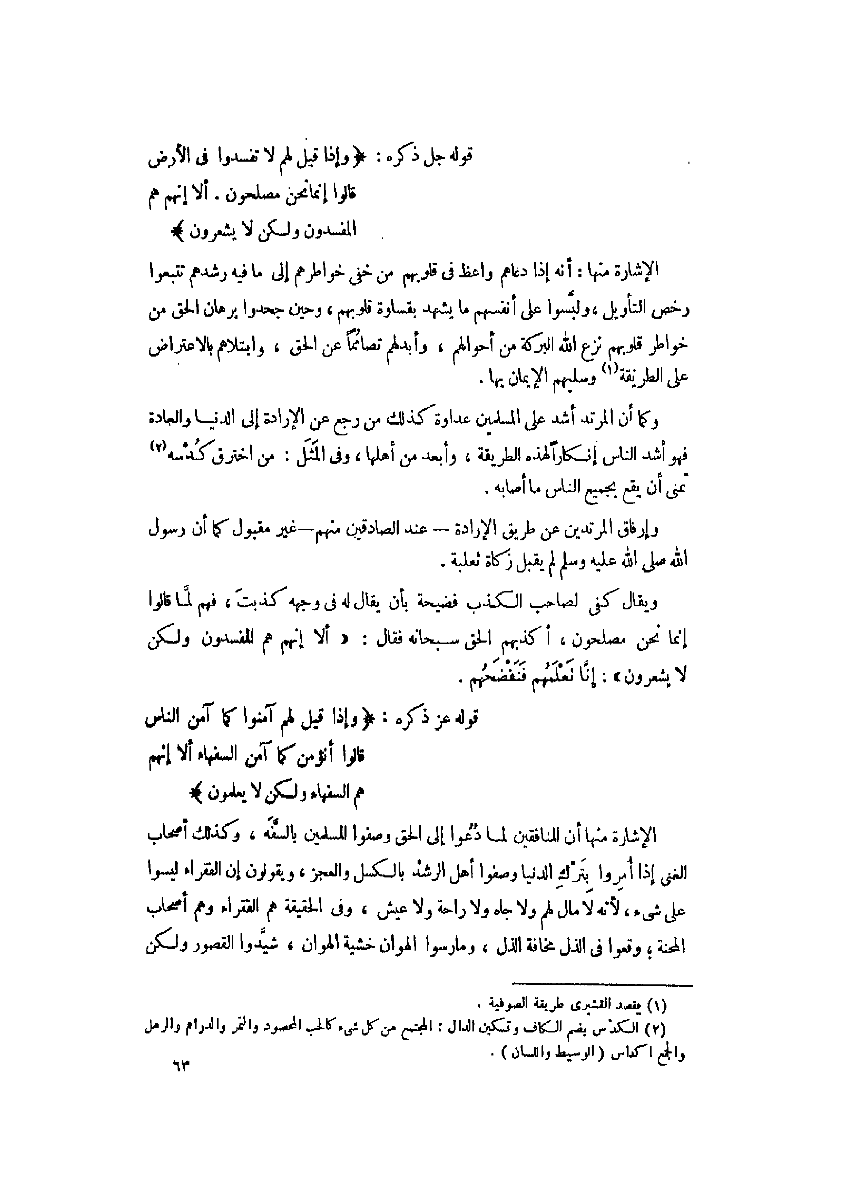 الإشارة منها أن المنافقين لما دعوا إلى الحق وصفوا المسلمين بالسّفه، وكذلك أصحاب الغنى إذا أمروا بترك الدنيا وصفوا أهل الرشد بالكسل والعجز، ويقولون إن الفقراء ليسوا على شىء، لأنه لا مال لهم ولا جاه ولا راحة ولا عيش، وفى الحقيقة هم الفقراء وهم أصحاب المحنة وقعوا فى الذل مخالفة الذل، ومارسوا الهوان خشية الهوان، شيّدوا القصور ولكن
