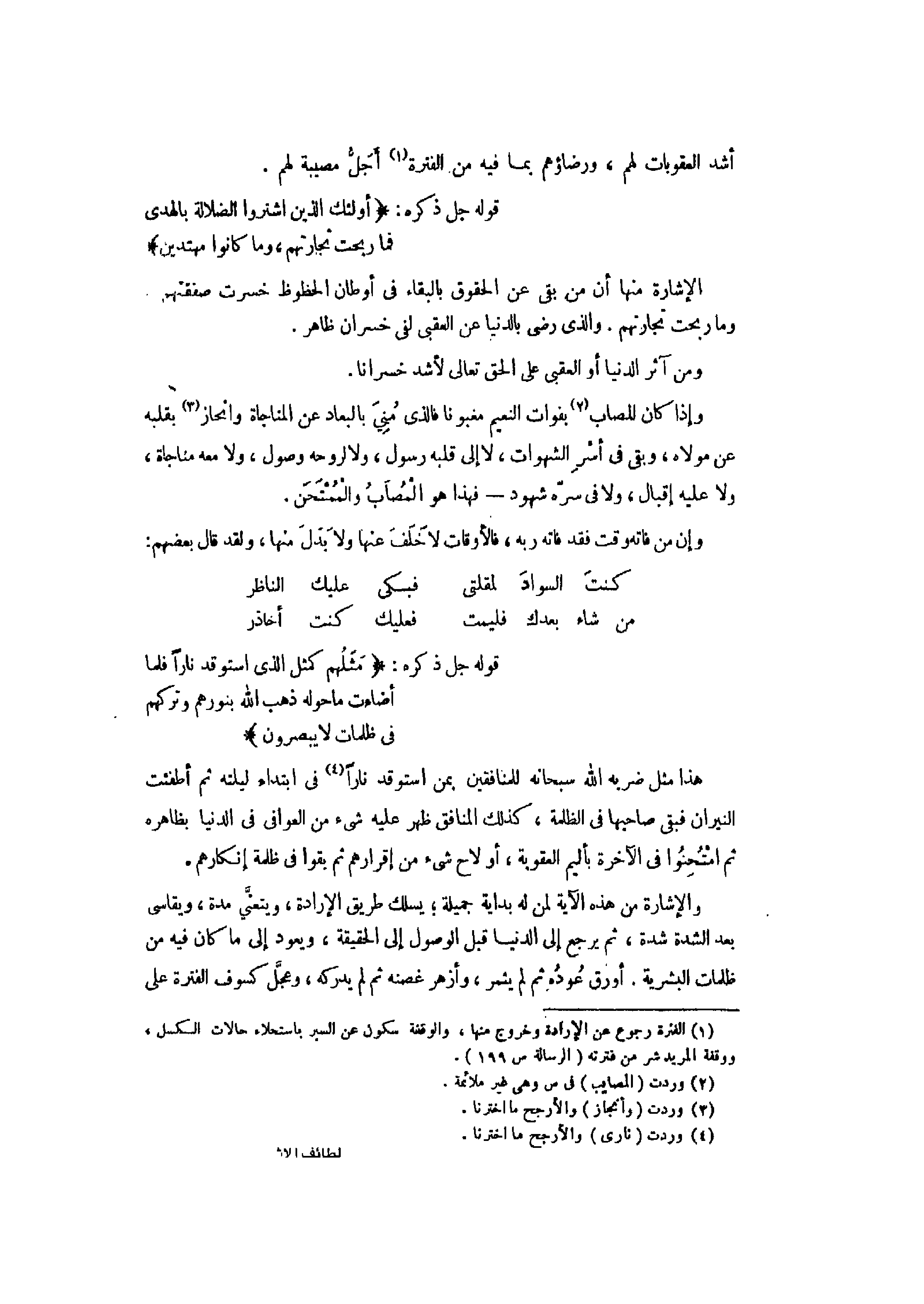 والإشارة من هذه الآية لمن له بداية جميلة يسلك طريق الإرادة، ويتعنّي مدة، ويقاسى بعد الشدة شدة، ثم يرجع إلى الدنيا قبل الوصول إلى الحقيقة، ويعود إلى ما كان فيه من ظلمات البشرية. أورق عوده ثم لم يثمر، وأزهر غصنه ثم لم يدركه، وعجّل كسوف الفترة على