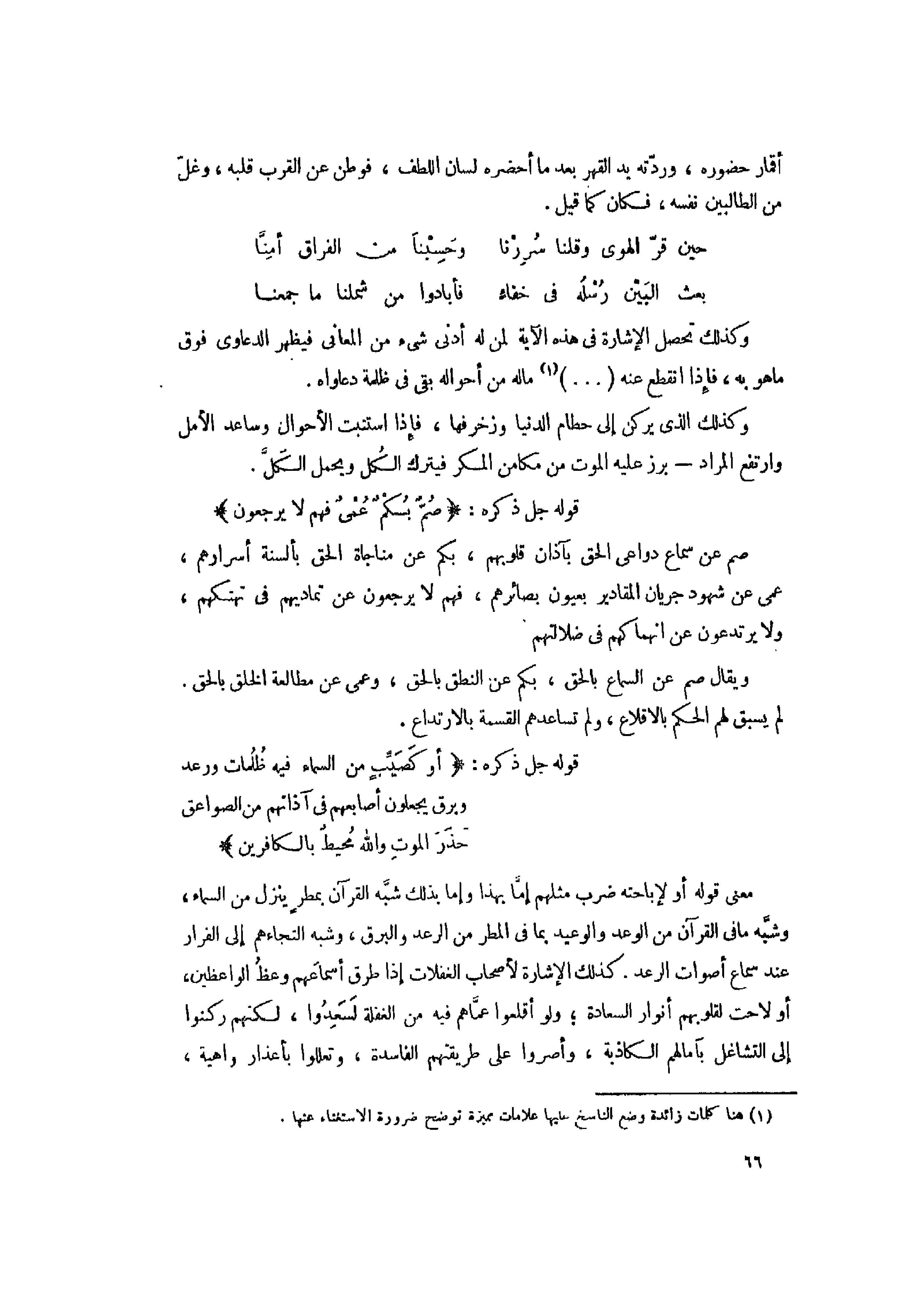 معنى قوله أو لإباحته ضرب مثلهم إمّا بهذا وإما بذلك شبّه القرآن بمطر ينزل من السماء، وشبّه ما فى القرآن من الوعد والوعيد بما فى المطر من الرعد والبرق، وشبه التجاءهم إلى الفرار عند سماع أصوات الرعد. كذلك الإشارة لأصحاب الغفلات إذا طرق أسماعهم وعظ الواعظين، أو لاحت لقلوبهم أنوار السعادة ولو أقلعوا عمّاهم فيه من الغفلة لسعدوا، لكنهم ركنوا إلى التشاغل بآمالهم الكاذبة، وأصروا على طريقتهم الفاسدة، وتعللوا بأعذار واهية،