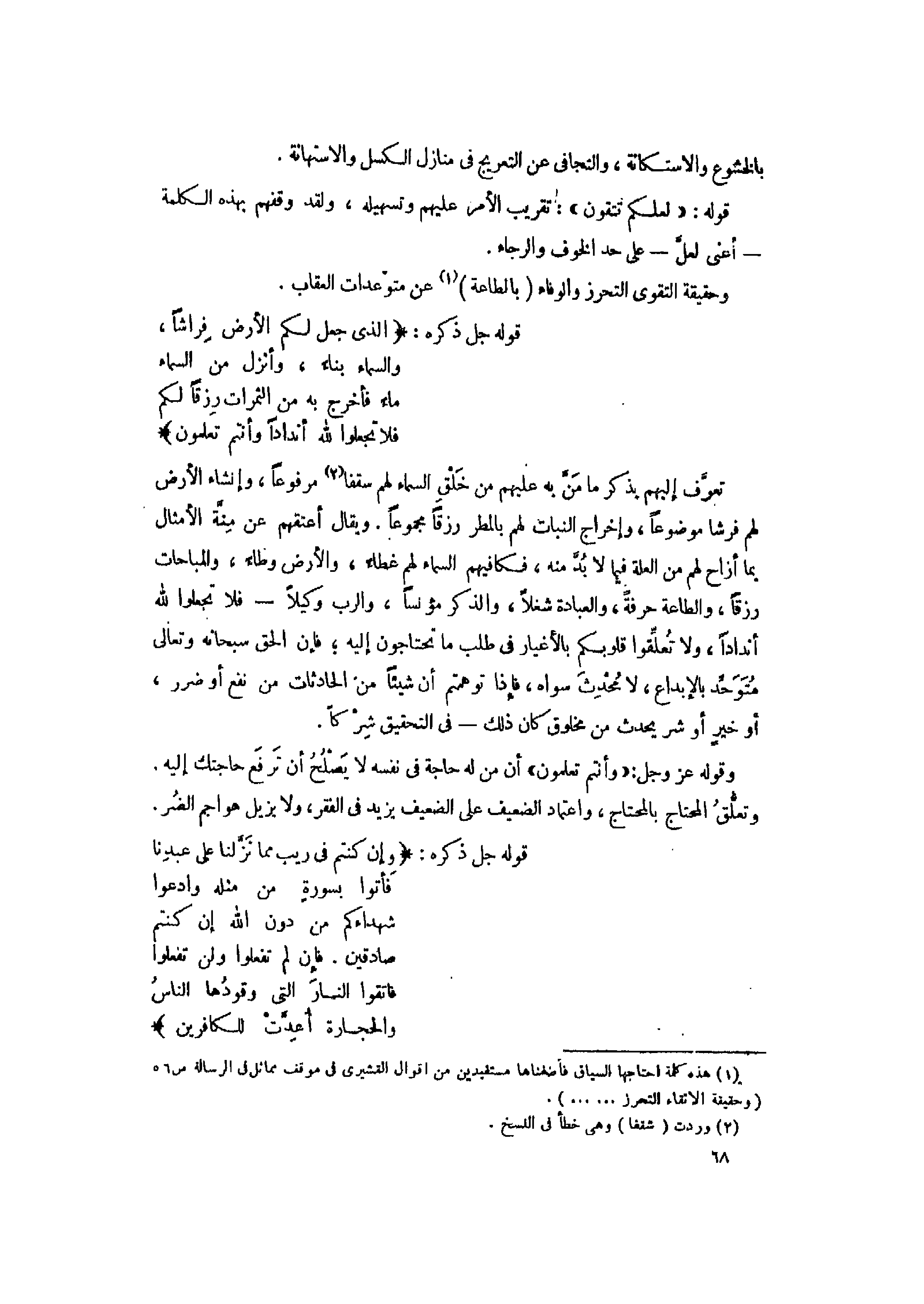 (1) هذه كلمة احتاجها السياق فآضفناها مستفيدين من اقوال القشيري فى موقف مماثل فى الرسالة ص 56 (وحقيقة الاتقاء التحرز......) .