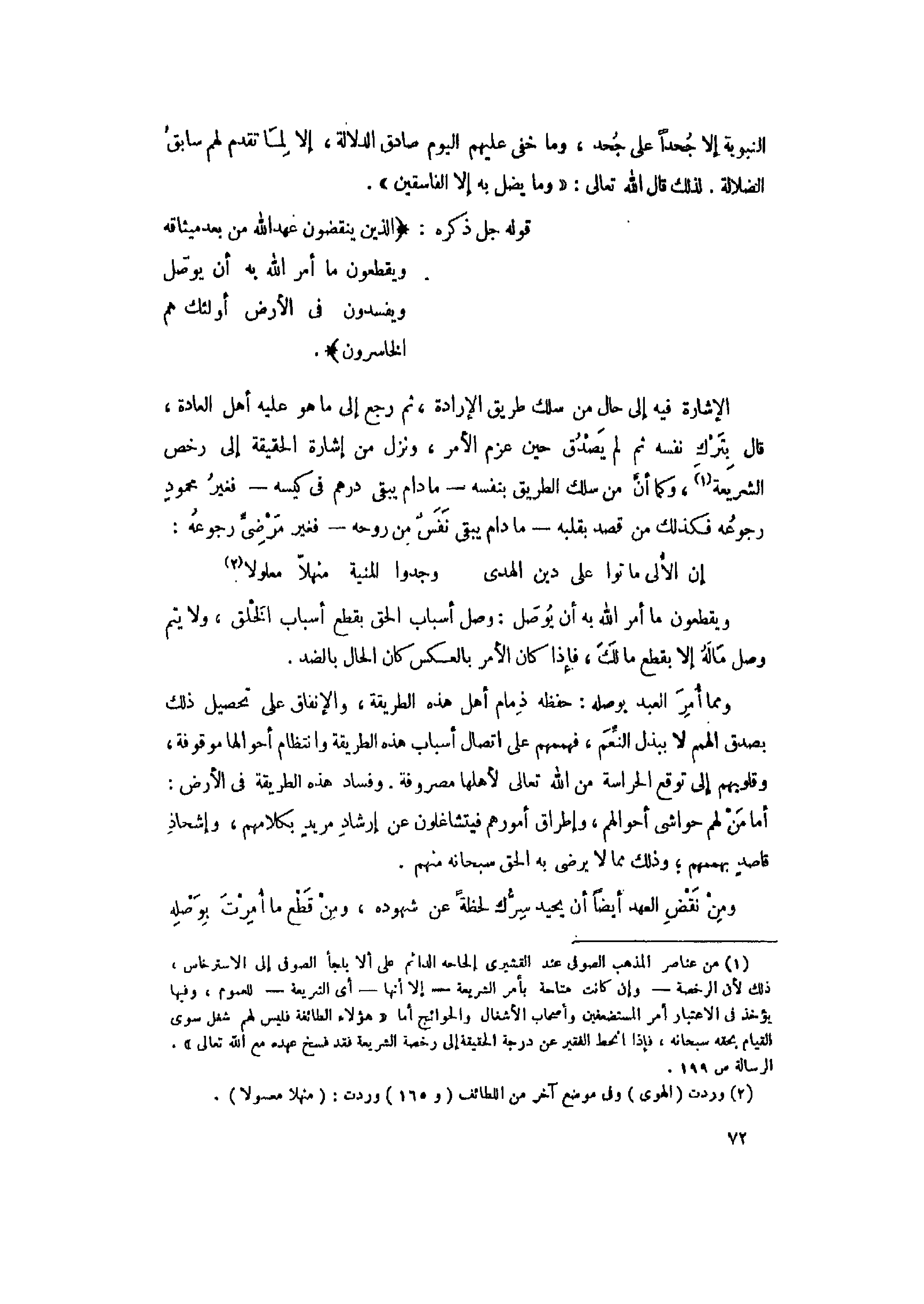الإشارة فيه إلى حال من سلك طريق الإرادة، ثم رجع إلى ما هو عليه أهل العادة، قال بترك نفسه ثم لم يصدق حين عزم الأمر، ونزل من إشارة الحقيقة إلى رخص الشريعة «1» ، وكما أنّ من سلك الطريق بنفسه- مادام يبقى درهم فى كيسه- فغير محمود رجوعه فكذلك من قصد بقلبه- مادام يبقى نفس من روحه- فغير مرضىّ رجوعه: