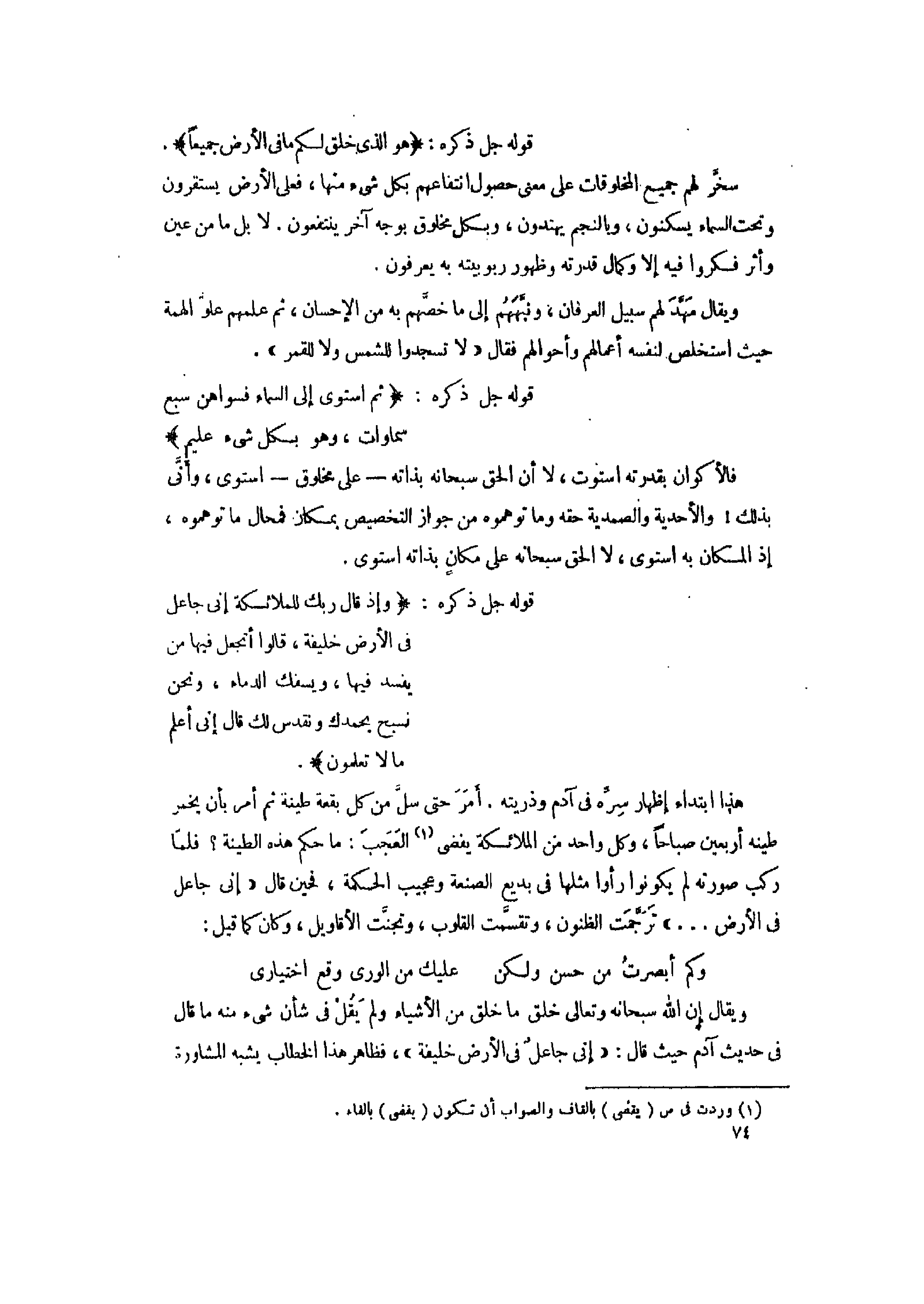ويقال إن الله سبحانه وتعالى خلق ما خلق من الأشياء ولم يقل فى شأن شىء منه ما قال فى حديث آدم حيث قال: «إِنِّي جاعِلٌ فِي الْأَرْضِ خَلِيفَةً» ، فظاهر هذا الخطاب يشبه المشاورة