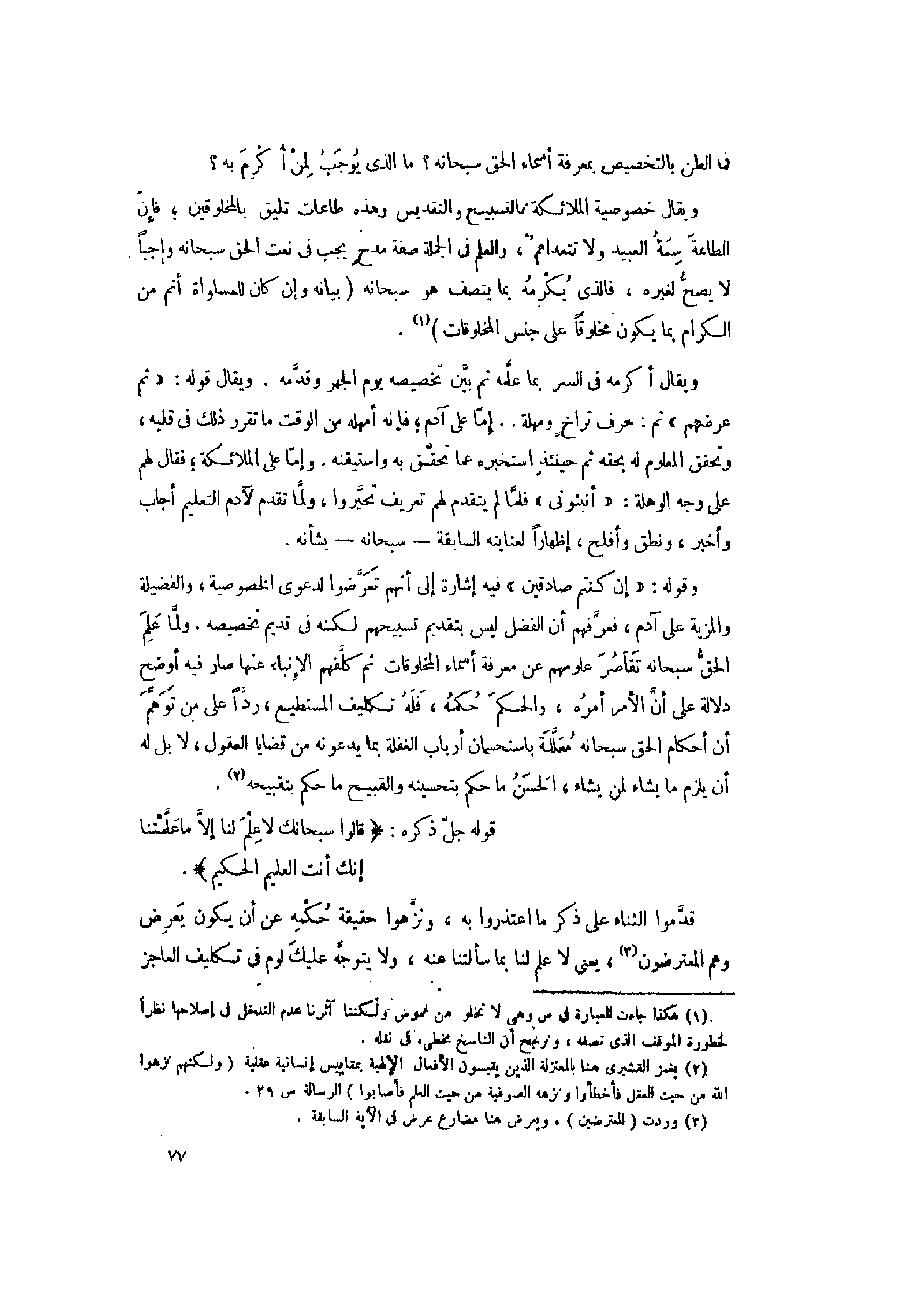 ويقال خصوصية الملائكة بالتسبيح والتقديس وهذه طاعات تليق بالمخلوقين فإنّ الطاعة سمة العبيد ولا تتعداهم، والعلم فى الجملة صفة مدح يجب فى نعت الحق سبحانه واجبا لا يصحّ لغيره، فالذى يكرمه بما يتصف هو سبحانه (بيانه وإن كان للمساواة أتم من الكرام بما يكون مخلوقا على جنس المخلوقات) «1» .