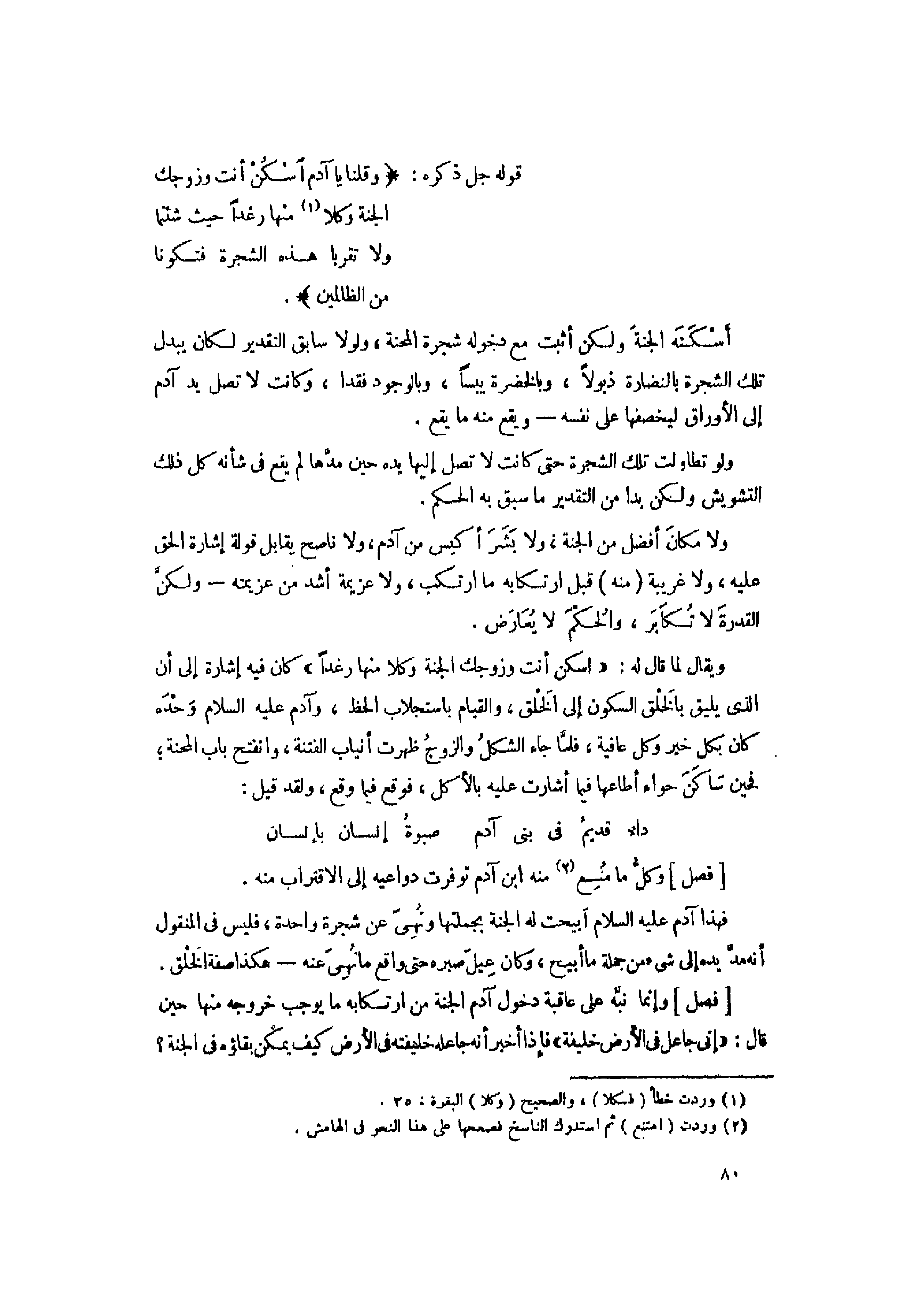 [فصل] وإنما نبّه على عاقبة دخول آدم الجنة من ارتكابه ما يوجب خروجه منها حين قال: «إِنِّي جاعِلٌ فِي الْأَرْضِ خَلِيفَةً» فإذا أخبر أنه جاعله خليفته فى الأرض كيف يمكن بقاؤه فى الجنة؟
