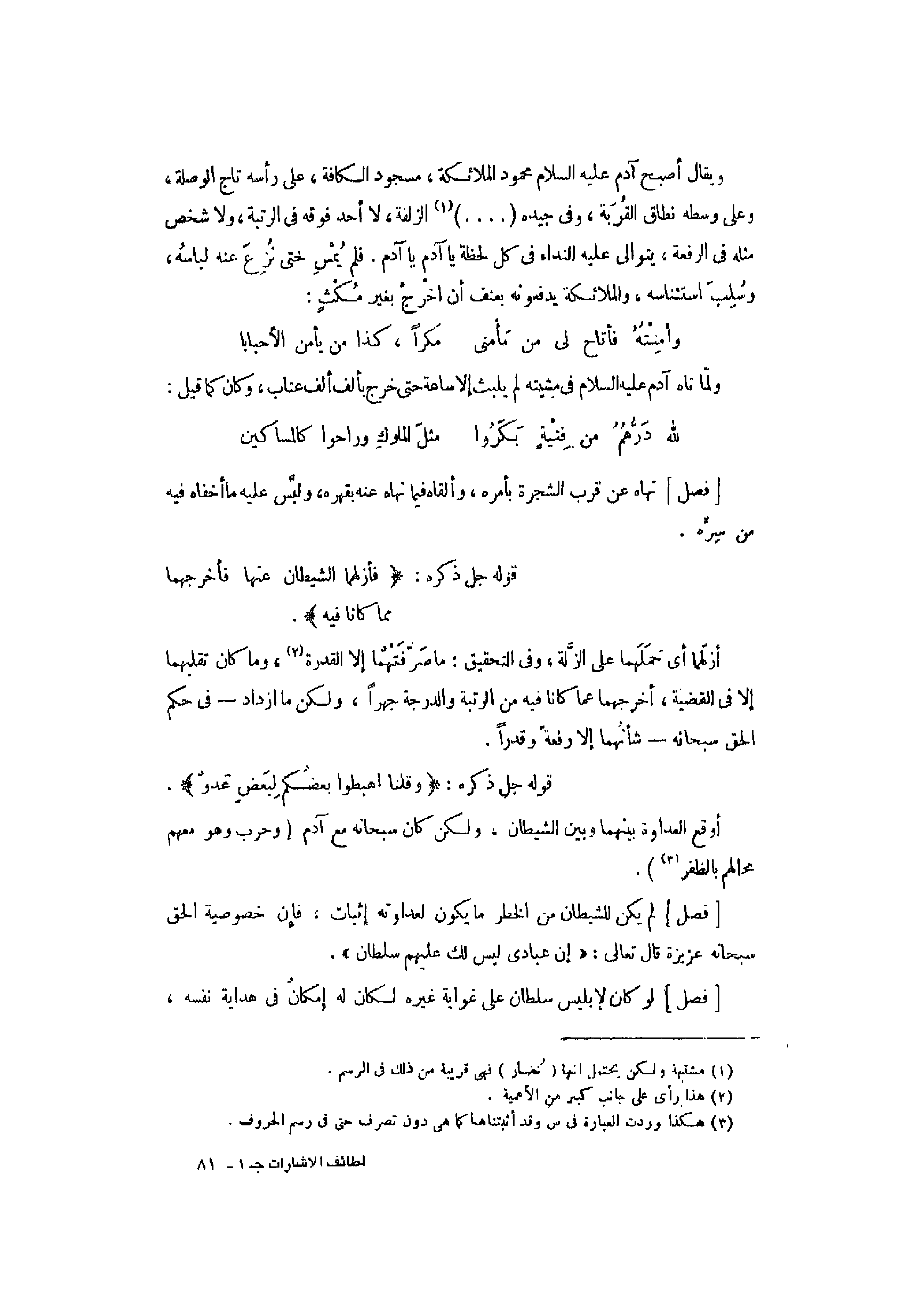 ويقال أصبح آدم عليه السّلام محمود الملائكة، مسجود الكافة، على رأسه تاج الوصلة، وعلى وسطه نطاق القربة، وفى جيده (....) «1» الزلفة، لا أحد فوقه فى الرتبة، ولا شخص مثله فى الرفعة، يتوالى عليه النداء فى كل لحظة يا آدم يا آدم. فلم يمس حتى نزع عنه لباسه، وسلب استئناسه، والملائكة يدفعونه بعنف أن اخرج بغير مكث: