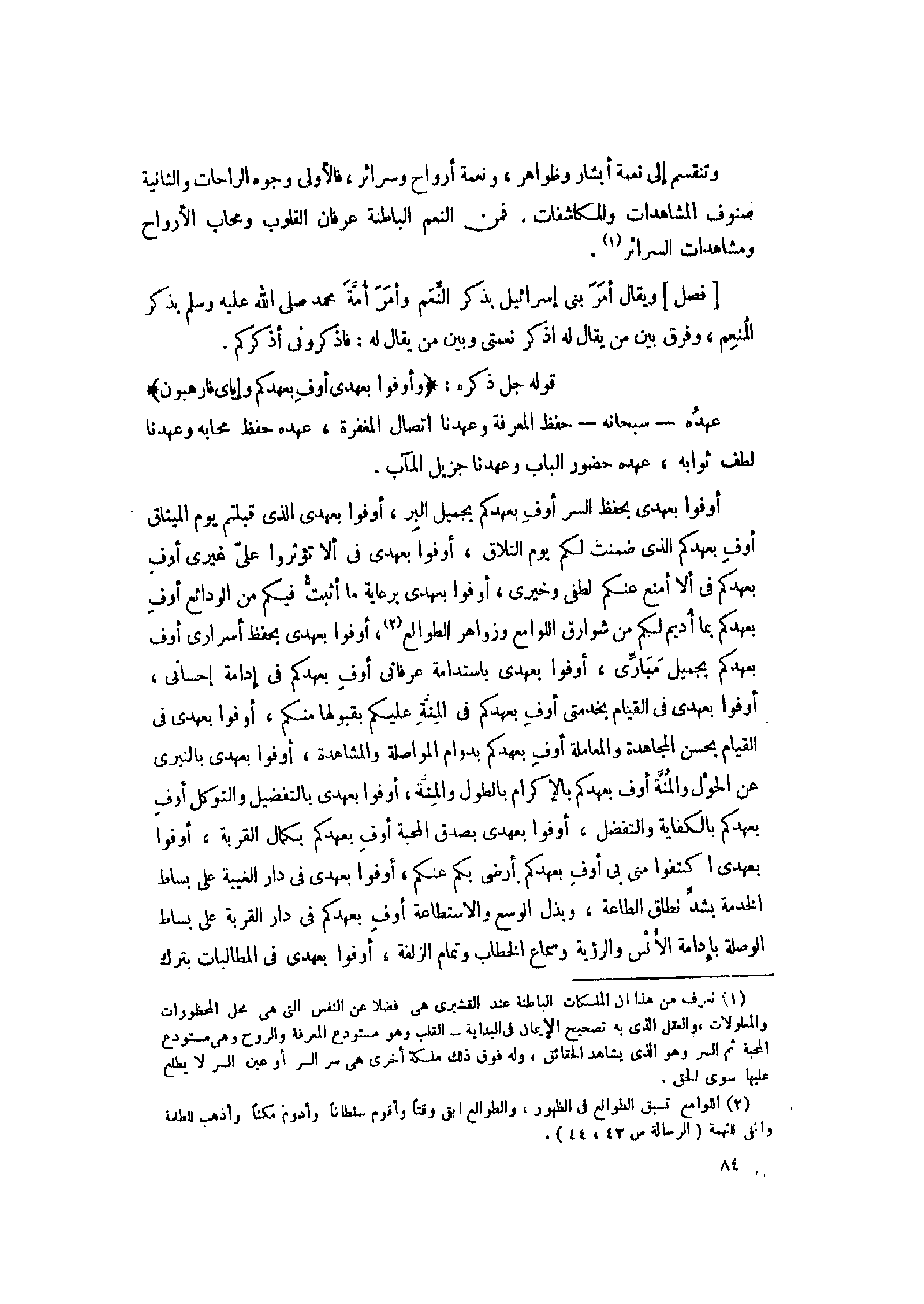 أوفوا بعهدي بحفظ السر أوف بعهدكم بجميل البر، أوفوا بعهدي الذي قبلتم يوم الميثاق أوف بعهدكم الذي ضمنت لكم يوم التلاق، أوفوا بعهدي فى ألا تؤثروا علىّ غيرى أوف بعهدكم فى ألا أمنع عنكم لطفى وخيرى، أوفوا بعهدي برعاية ما أثبتّ فيكم من الودائع أوف بعهدكم بما أديم لكم من شوارق اللوامع وزواهر الطوالع «2» ، أوفوا بعهدي بحفظ أسرارى أوف بعهدكم بجميل مبارّى، أوفوا بعهدي باستدامة عرفانى أوف بعهدكم فى إدامة إحسانى، أوفوا بعهدي فى القيام بخدمتي أوف بعهدكم فى المنّة عليكم بقبولها منكم، أوفوا بعهدي فى القيام بحسن المجاهدة والمعاملة أوف بعهدكم بدوام المواصلة والمشاهدة، أوفوا بعهدي بالتبري عن الحول والمنّة أوف بعهدكم بالإكرام بالطول والمنّة، أوفوا بعهدي بالتفضيل والتوكل أوف بعهدكم بالكفاية والتفضل، أوفوا بعهدي بصدق المحبة أوف بعهدكم بكمال القربة، أوفوا بعهدي اكتفوا منى بي أوف بعهدكم أرضى بكم عنكم، أوفوا بعهدي فى دار الغيبة على بساط الخدمة بشدّ نطاق الطاعة، وبذل الوسع والاستطاعة أوف بعهدكم فى دار القربة على بساط الوصلة بإدامة الأنس والرؤية وسماع الخطاب وتمام الزلفة، أوفوا بعهدي فى المطالبات بترك