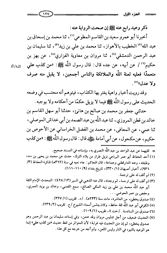 أخبرنا أبو عمرو سعيد بن القاسم المطوعي، ثنا محمد بن إسحاق بن عبد الله الخطيب بالأهواز، ثنا محمد بن علي بن زيد، ثنا سليمان بن عبد الرحمن الدمشقي، ثنا مروان بن معاوية الفزاري، عن بهز بن حكيم عن أبيه، عن جده قال: قال رسول الله صلى الله عليه وسلم : ((من كذب علي متعمدًا فعليه لعنة الله والملائكة والناس أجمعين، لا يقبل منه صرف ولا عدل)).