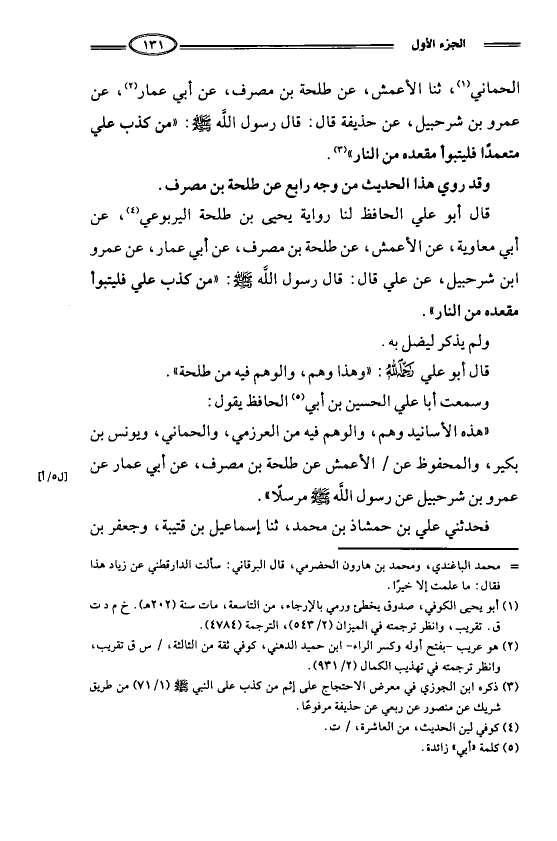 قال أبو علي الحافظ لنا رواية يحيى بن طلحة اليربوعي، عن أبي معاوية، عن الأعمش، عن طلحة بن مصرف، عن أبي عمار، عن عمرو بن شرحبيل، عن علي قال: قال رسول الله صلى الله عليه وسلم : ((من كذب علي فليتبوأ مقعده من النار)).