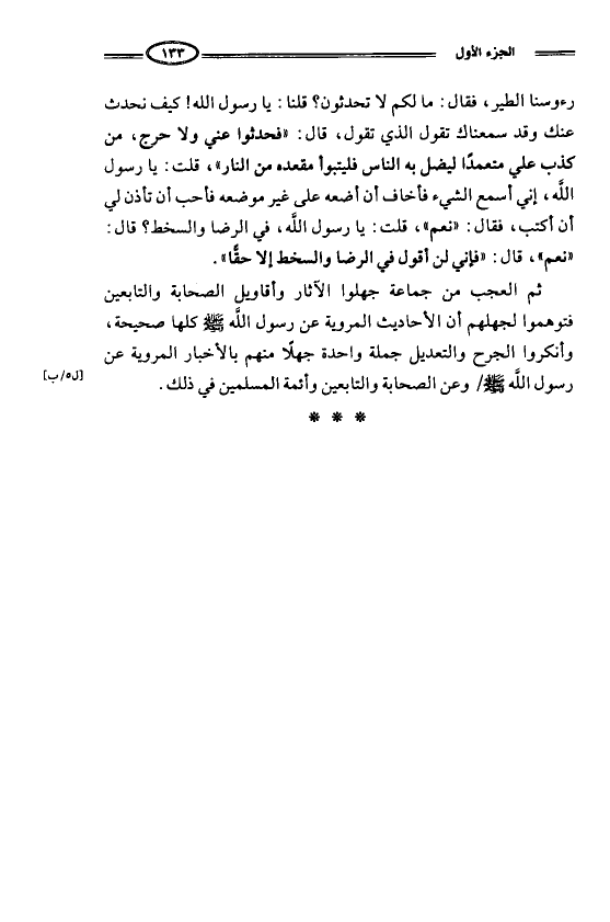 رءوسنا الطير، فقال: ما لكم لا تحدثون؟ قلنا: يا رسول الله! كيف نحدث عنك وقد سمعناك تقول الذي تقول، قال: ((فحدثوا عني ولا حرج، من كذب علي متعمدًا ليضل به الناس فليتبوأ مقعده من النار))، قلت: يا رسول الله، إني أسمع الشيء فأخاف أن أضعه على غير موضعه فأحب أن تأذن لي أن أكتب، فقال: ((نعم))، قلت: يا رسول الله، في الرضا والسخط؟ قال: ((نعم))، قال: ((فإني لن أقول في الرضا والسخط إلا حقًّا)).