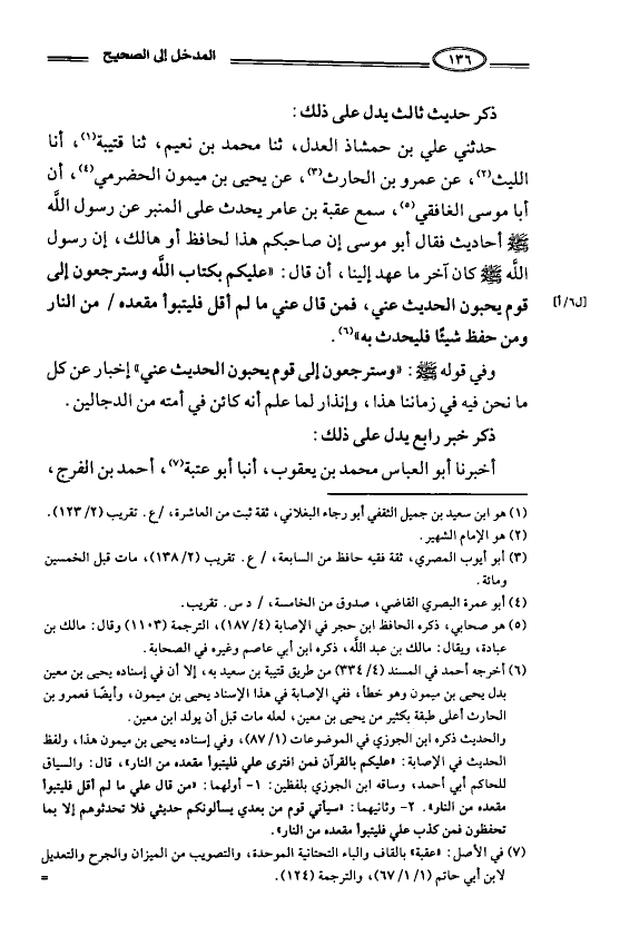 حدثني علي بن حمشاذ العدل، ثنا محمد بن نعيم، ثنا قتيبة، أنا الليث، عن عمرو بن الحارث، عن يحيى بن ميمون الحضرمي، أن أبا موسى الغافقي، سمع عقبة بن عامر يحدث على المنبر عن رسول الله صلى الله عليه وسلم أحاديث فقال أبو موسى إن صاحبكم هذا لحافظ أو هالك، إن رسول الله صلى الله عليه وسلم كان آخر ما عهد إلينا، أن قال: ((عليكم بكتاب الله وسترجعون إلى قوم يحبون الحديث عني، فمن قال عني ما لم أقل فليتبوأ مقعده من النار ومن حفظ شيئًا فليحدث به)).