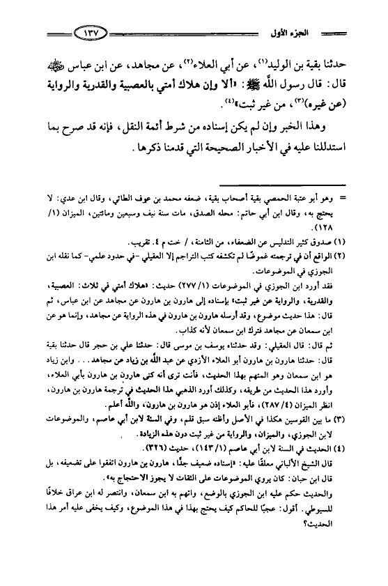 حدثنا بقية بن الوليد،عن أبي العلاء، عن مجاهد، عن ابن عباس رضي الله عنه قال: قال رسول الله صلى الله عليه وسلم : ((ألا وإن هلاك أمتي بالعصبية والقدرية والرواية (عن غيره)، من غير ثبت)).