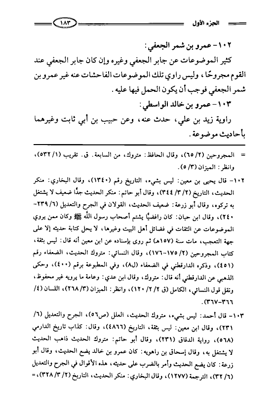 كثير الموضوعات عن جابر الجعفي وغيره وإن كان جابر الجعفي عند القوم مجروحًا، وليس راوي تلك الموضوعات الفاحشات عنه غير عمرو بن شمر الجعفي فوجب أن يكون الحمل فيها عليه.