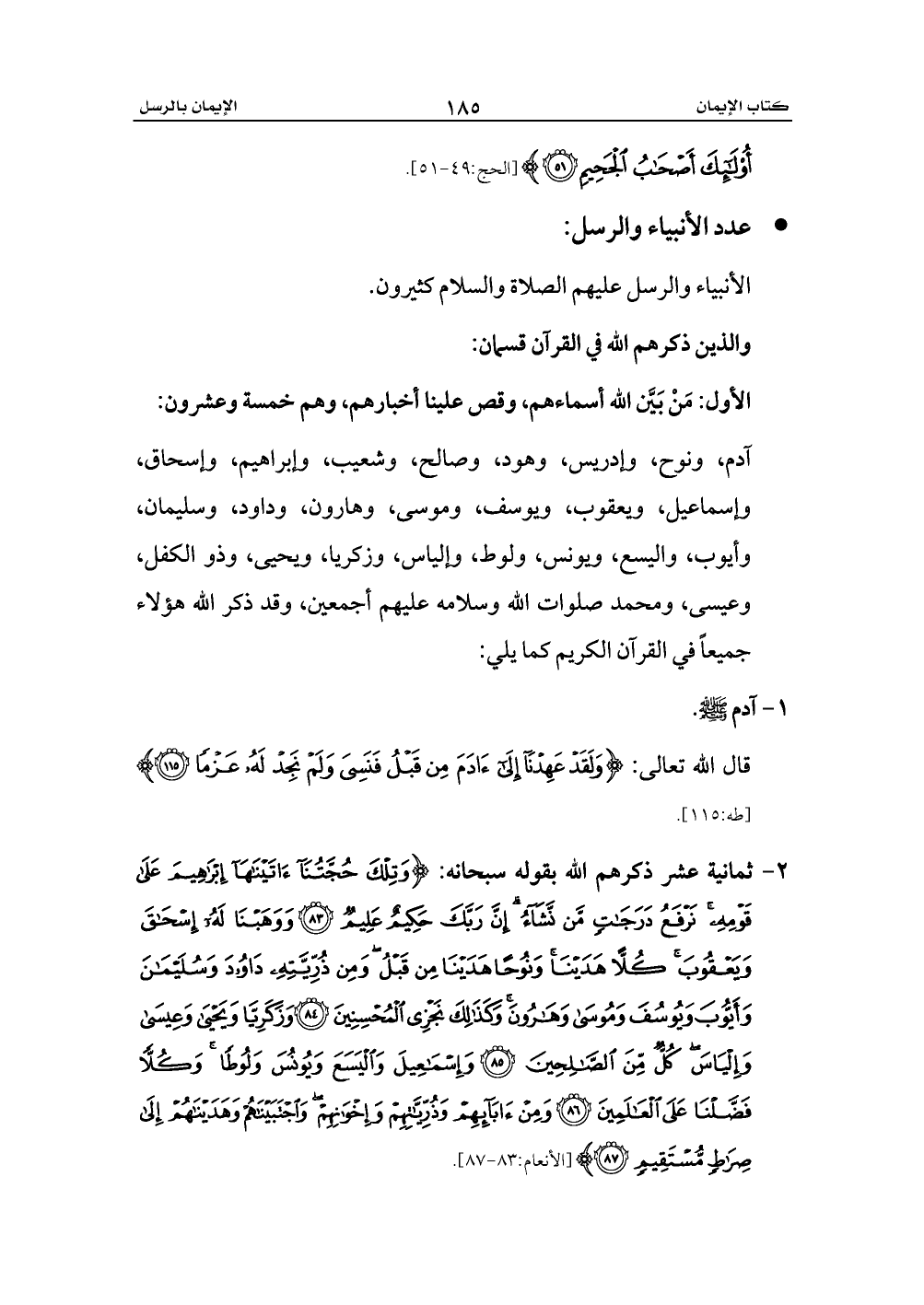2 - ثمانية عشر ذكرهم الله بقوله سبحانه: {وَتِلْكَ حُجَّتُنَا آتَيْنَاهَا إِبْرَاهِيمَ عَلَى قَوْمِهِ نَرْفَعُ دَرَجَاتٍ مَنْ نَشَاءُ إِنَّ رَبَّكَ حَكِيمٌ عَلِيمٌ (83) وَوَهَبْنَا لَهُ إِسْحَاقَ وَيَعْقُوبَ كُلًّا هَدَيْنَا وَنُوحًا هَدَيْنَا مِنْ قَبْلُ وَمِنْ ذُرِّيَّتِهِ دَاوُودَ وَسُلَيْمَانَ وَأَيُّوبَ وَيُوسُفَ وَمُوسَى وَهَارُونَ وَكَذَلِكَ نَجْزِي الْمُحْسِنِينَ (84) وَزَكَرِيَّا وَيَحْيَى وَعِيسَى وَإِلْيَاسَ كُلٌّ مِنَ الصَّالِحِينَ (85) وَإِسْمَاعِيلَ وَالْيَسَعَ وَيُونُسَ وَلُوطًا وَكُلًّا فَضَّلْنَا عَلَى الْعَالَمِينَ (86) وَمِنْ آبَائِهِمْ وَذُرِّيَّاتِهِمْ وَإِخْوَانِهِمْ وَاجْتَبَيْنَاهُمْ وَهَدَيْنَاهُمْ إِلَى