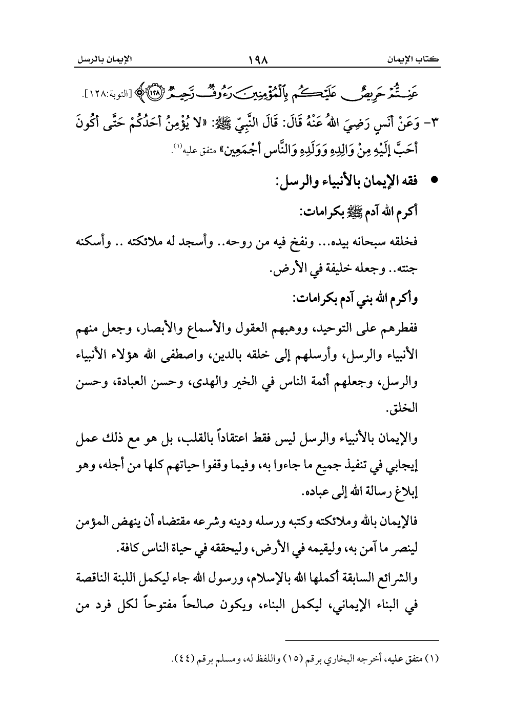 3 - وَعَنْ أنَسٍ رَضِيَ اللهُ عَنْهُ قَالَ: قَالَ النَّبِيّ - صلى الله عليه وسلم -: «لا يُؤْمِنُ أحَدُكُمْ حَتَّى أكُونَ أحَبَّ إلَيْهِ مِنْ وَالِدِهِ وَوَلَدِهِ وَالنَّاس أجْمَعِين» متفق عليه (¬1).
