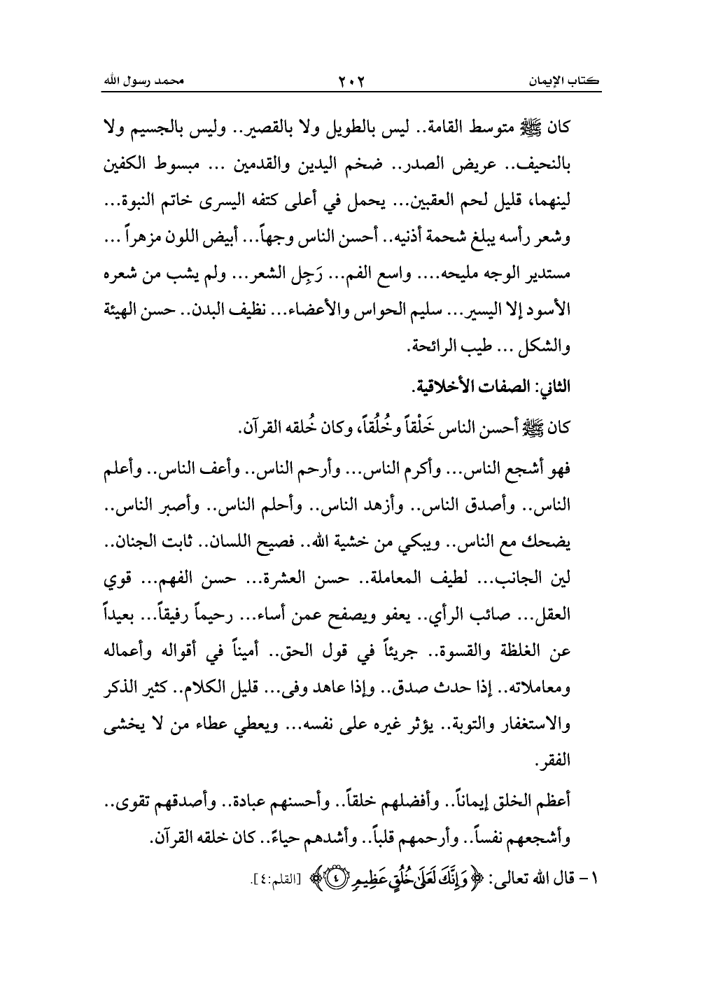 أعظم الخلق إيماناً .. وأفضلهم خلقاً .. وأحسنهم عبادة .. وأصدقهم تقوى .. وأشجعهم نفساً .. وأرحمهم قلباً .. وأشدهم حياءً .. كان خلقه القرآن.