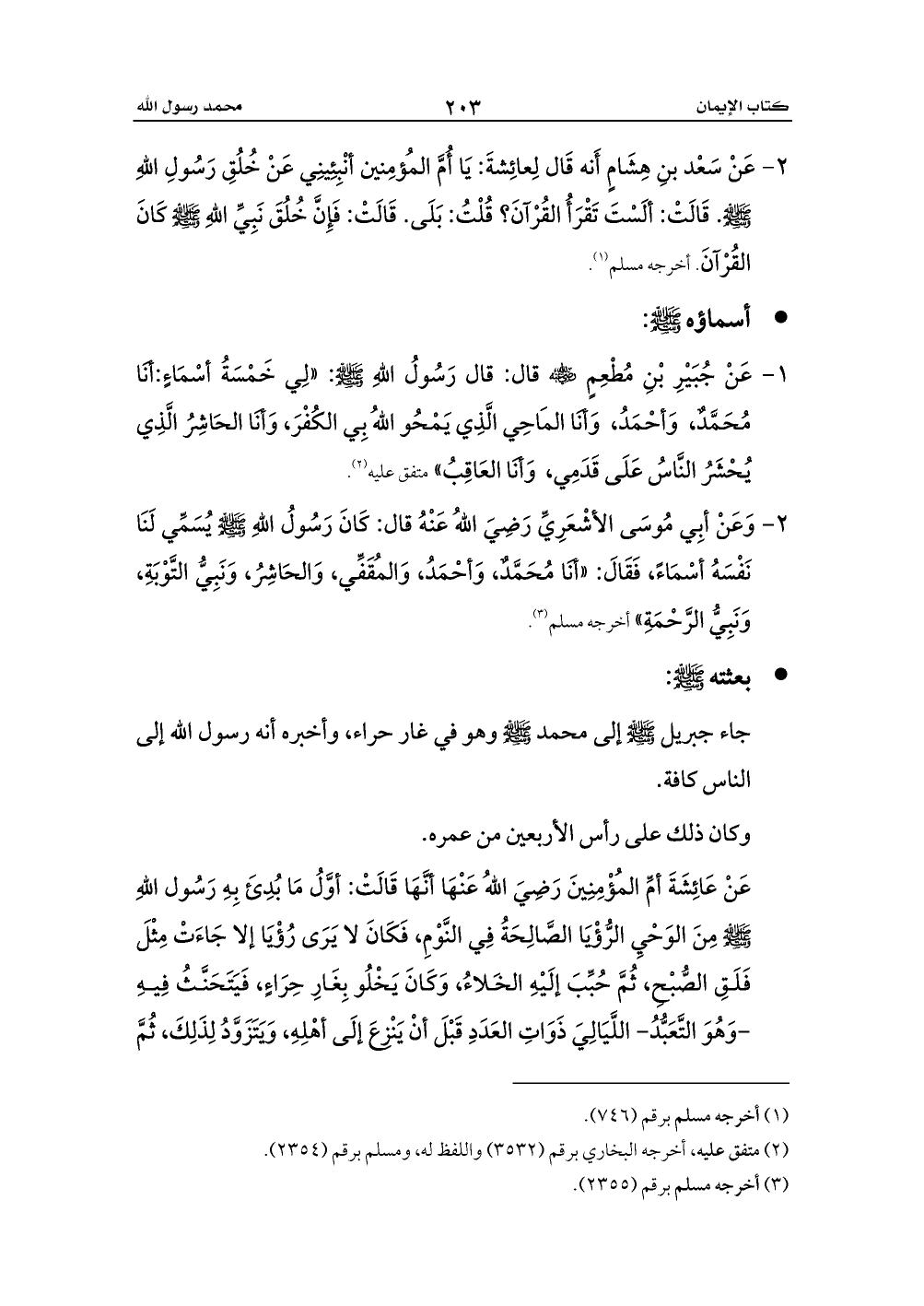 1 - عَنْ جُبَيْرِ بْنِ مُطْعِمٍ - رضي الله عنه - قال: قال رَسُولُ اللهِ - صلى الله عليه وسلم -: «لِي خَمْسَةُ أسْمَاءٍ: أنَا مُحَمَّدٌ، وَأحْمَدُ، وَأنَا المَاحِي الَّذِي يَمْحُو اللهُ بِي الكُفْرَ، وَأنَا الحَاشِرُ الَّذِي يُحْشَرُ النَّاسُ عَلَى قَدَمِي، وَأنَا العَاقِبُ» متفق عليه (¬2).