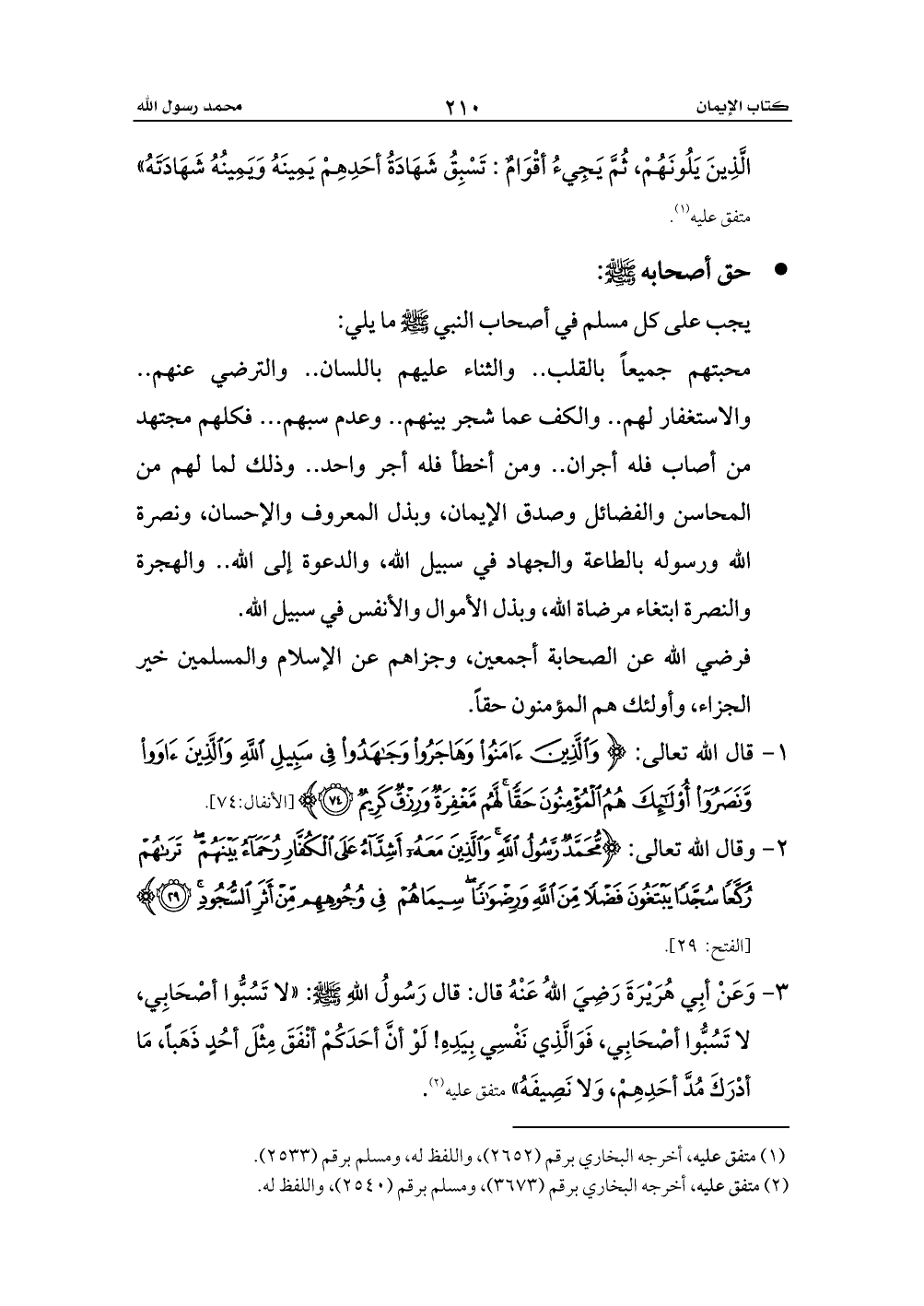 3 - وَعَنْ أبِي هُرَيْرَةَ رَضِيَ اللهُ عَنْهُ قال: قال رَسُولُ اللهِ - صلى الله عليه وسلم -: «لا تَسُبُّوا أصْحَابِي، لا تَسُبُّوا أصْحَابِي، فَوَالَّذِي نَفْسِي بِيَدِهِ! لَوْ أنَّ أحَدَكُمْ أنْفَقَ مِثْلَ أحُدٍ ذَهَباً، مَا أدْرَكَ مُدَّ أحَدِهِمْ، وَلا نَصِيفَهُ» متفق عليه (¬2).