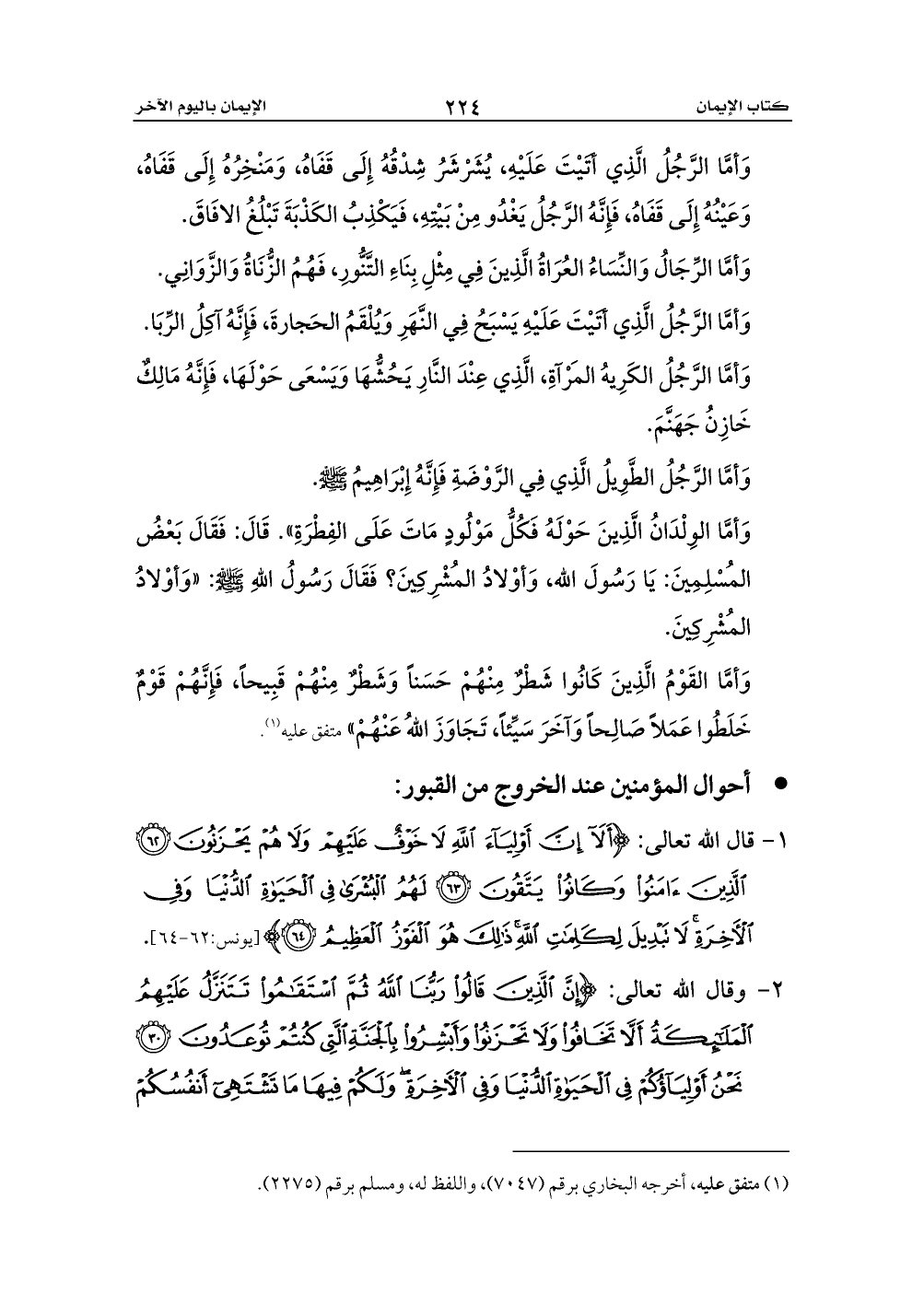 1 - قال الله تعالى: {أَلَا إِنَّ أَوْلِيَاءَ اللَّهِ لَا خَوْفٌ عَلَيْهِمْ وَلَا هُمْ يَحْزَنُونَ (62) الَّذِينَ آمَنُوا وَكَانُوا يَتَّقُونَ (63) لَهُمُ الْبُشْرَى فِي الْحَيَاةِ الدُّنْيَا وَفِي الْآخِرَةِ لَا تَبْدِيلَ لِكَلِمَاتِ اللَّهِ ذَلِكَ هُوَ الْفَوْزُ الْعَظِيمُ (64)} [يونس:62 - 64].