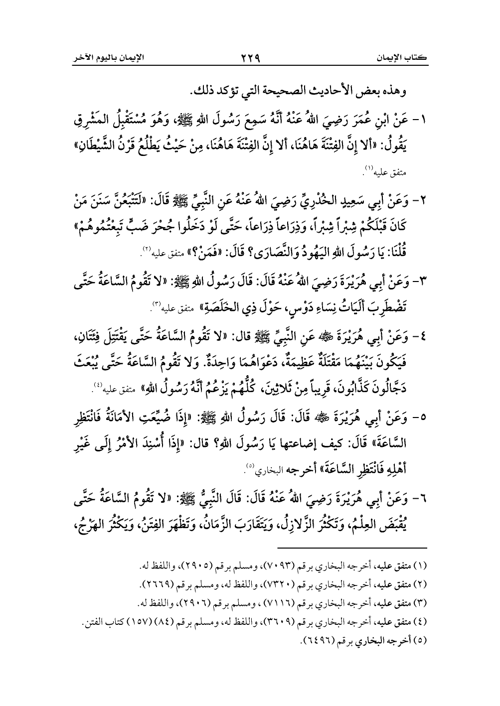 1 - عَنْ ابْنِ عُمَرَ رَضِيَ اللهُ عَنْهُ أنَّهُ سَمِعَ رَسُولَ اللهِ - صلى الله عليه وسلم -، وَهُوَ مُسْتَقْبِلُ المَشْرِقِ يَقُولُ: «ألا إِنَّ الفِتْنَةَ هَاهُنَا، ألا إِنَّ الفِتْنَةَ هَاهُنَا، مِنْ حَيْثُ يَطْلُعُ قَرْنُ الشَّيْطَانِ» متفق عليه (¬1).