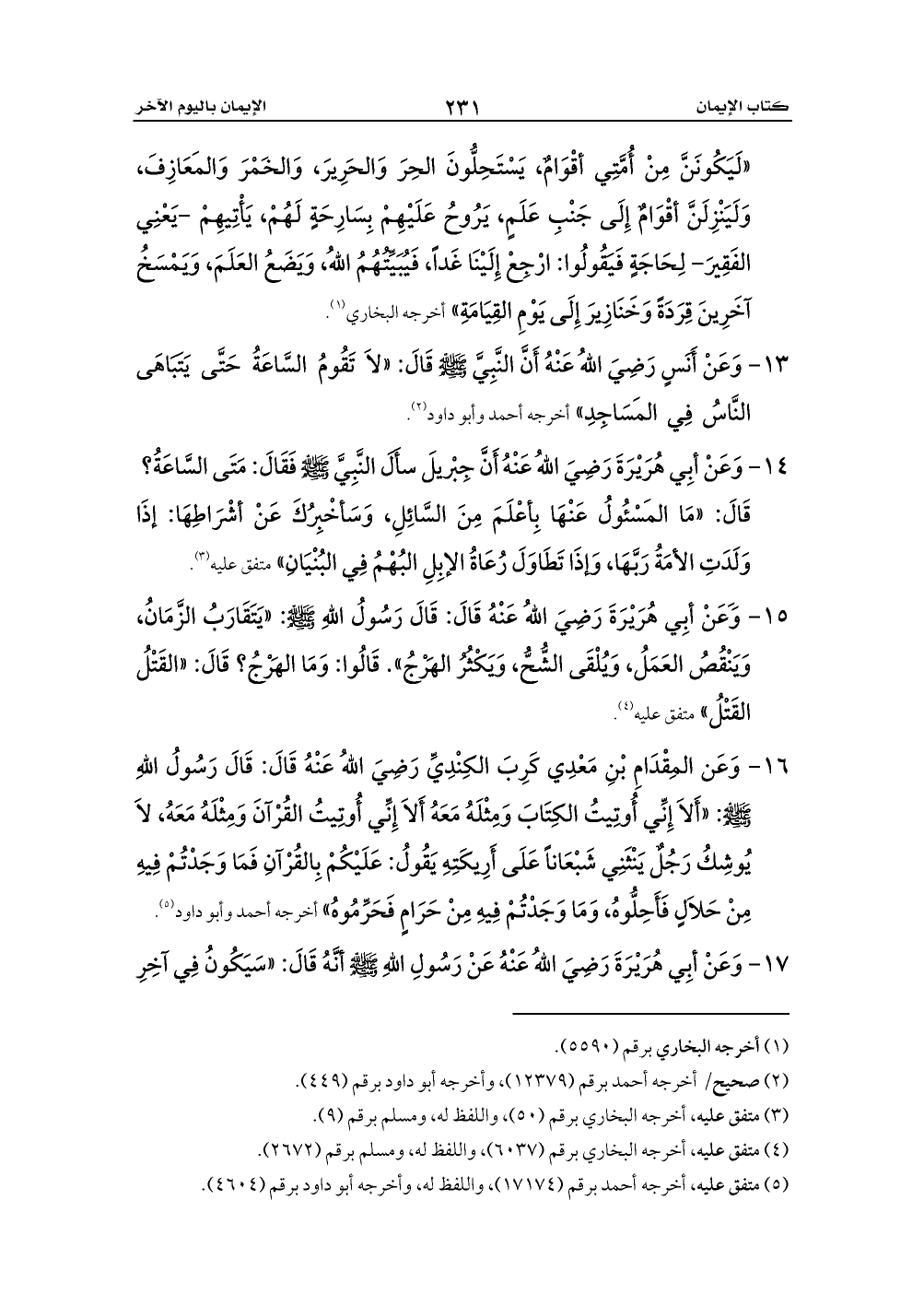 17 - وَعَنْ أبِي هُرَيْرَةَ رَضِيَ اللهُ عَنْهُ عَنْ رَسُولِ اللهِ - صلى الله عليه وسلم - أنَّهُ قَالَ: «سَيَكُونُ فِي آخِرِ